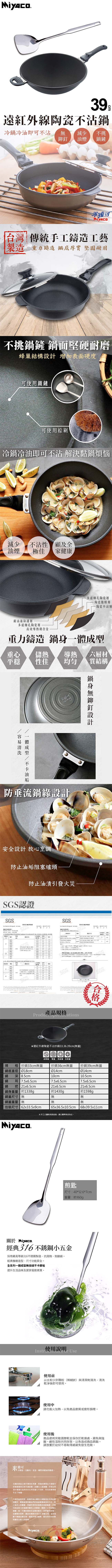 米雅可 遠紅外線陶瓷不沾炒鍋39cm(無蓋)MY-B01W390贈316不鏽鋼煎匙MY-J100010 ■ 台灣製造 ■ 本系列產品採用陶瓷腹膜科技不沾處理技術,擁有絕佳的耐用度及不沾的效果 ■ 鍋身無鉚釘一體成型設計;特殊蜂巢結構,增加表面硬度,可使用金屬鏟 ■ 不挑鍋鏟,可使用棕刷清洗 ■ 鍋緣防垂流設計,防止油漬沾汙鍋底;可拆式手把,方便清潔及收納 ■ 台灣傳統手工鑄造工藝,加厚鍋身,堅固經久耐用,儲熱性極佳 ■ SGS認證 ■ 適用鹵素爐、電爐、陶瓷爐、瓦斯爐等爐具 贈 米雅可 經典316不鏽鋼煎匙 MY-J100010 ■ 頂級316不鏽鋼材質製造,因添加鉬元素,使其更耐酸鹼及腐蝕 ■ 一體成形,方便清洗,不易藏汙納垢 ■ 精緻鋼印,無捲邊設計,特級厚度,堅固耐用 ■ 手柄處採特殊斷熱處理設計,不易燙手
