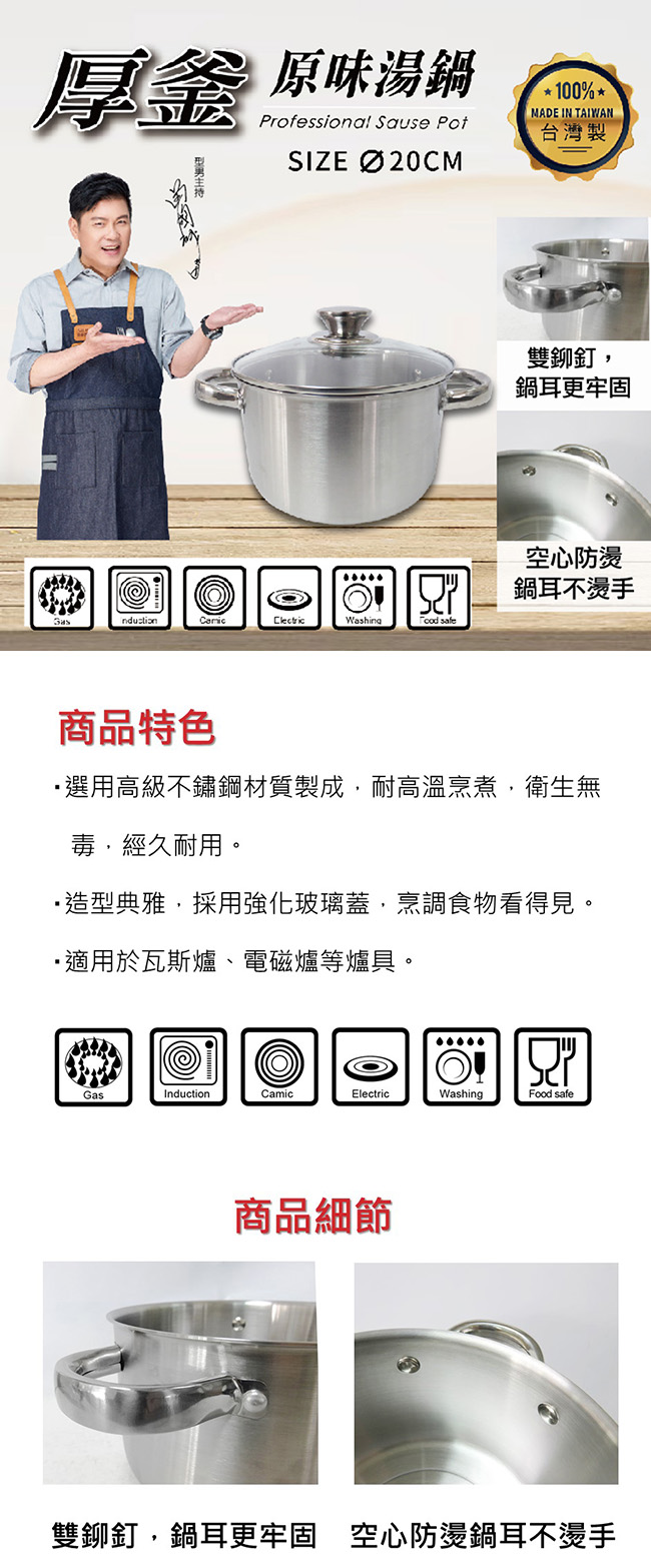 主商品:湯鍋x1 規格:直徑20公分 材質:鍋身-420J2不鏽鋼,鍋耳、蓋珠-430不鏽鋼,鍋蓋-強化玻璃 容量:3.2公升(滿水量) 產地:台灣 以上規格±5% ※依照消費者保護法的規定,享有猶豫期的權益。 ※猶豫期並非試用期,所以,您所退回的商品必須是全新的狀態、而且完整包裝。 ※請注意保持商品本體、配件、贈品、保證書、原廠包裝及所有附隨文件或資料的完整性,切勿缺漏任何配件或毀損原廠外盒。 ※若有遺失或汙損,將會視情況酌收相關費用。