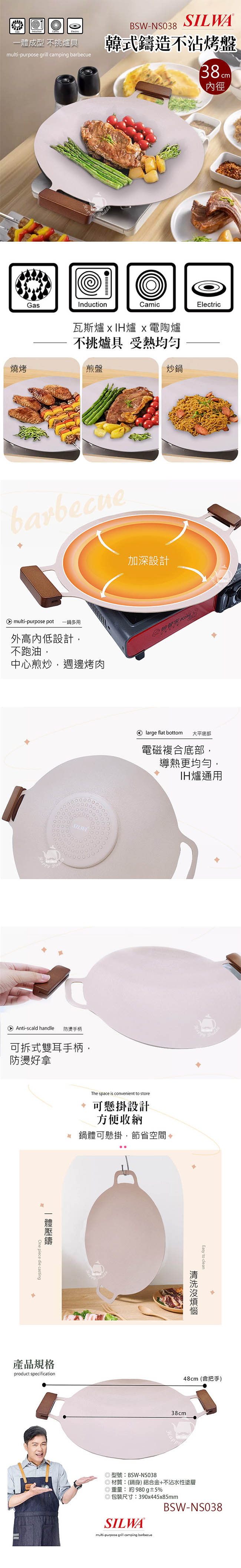 西華 韓式鑄造不沾烤盤38CM(IH電磁爐可用) BSW-NS038 ■ 一盤多用、輕巧便攜 ■ 不沾鍋材質、導熱快速 ■ 不挑爐具、少油少煙 ■ 一體壓鑄、清洗便易 《使用方式》 使用時,採用中小火即可,待烤盤表面溫度溫熱後,即可開始使用 使用後,因烤盤本體溫度高,請待降溫後再進行清洗,洗後請以紙巾或者乾布擦乾再進行收納 《注意事項》