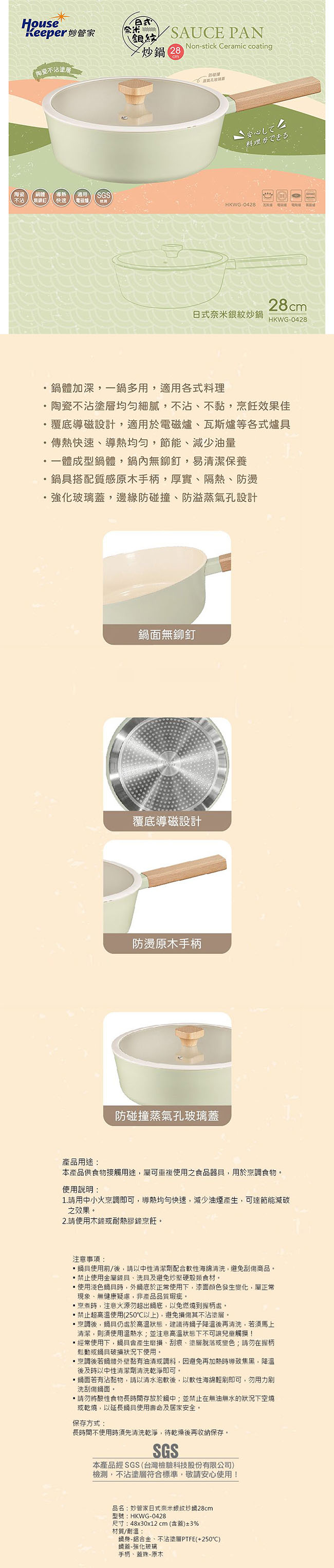 妙管家 日式奈米銀紋陶瓷不沾炒鍋28cm(附蓋) HKWG-0428 ■ 鍋體加深,一鍋多用,適用各式料理 ■ 陶瓷不沾塗層均勻細膩,不沾、不黏,烹飪效果佳 ■ 覆底導磁設計,適用於電磁、瓦斯爐等各式爐具 ■ 傳導快速、導熱均勻,節能、減少油量 ■ 一體成型鍋體,鍋內無鉚釘,易清潔保養 ■ 鍋具搭配質感原木炳,厚實、隔熱、防燙 ■ 強化玻璃蓋,邊緣防碰撞、防溢蒸氣孔設計