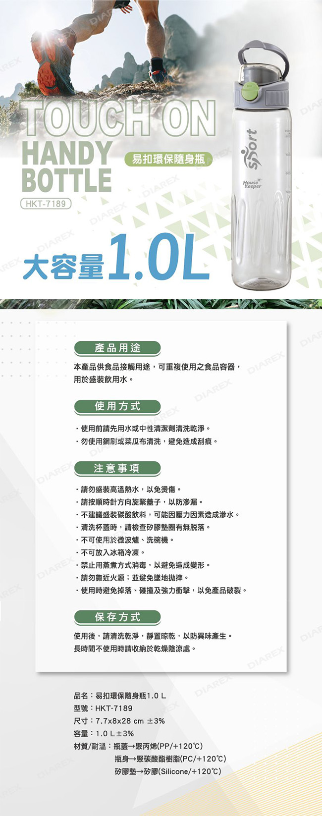 妙管家 易扣環保隨身瓶1000ml HKT-7189 ■ 瓶身PC材質,透明、無味、耐衝擊、不易受損,安全健康 ■ 瓶蓋大按鍵、鎖扣設計,一鍵開啟,輕鬆飲用 ■ 隨身瓶題還設計,輕鬆開啟,攜帶方便好提取 ■ 瓶蓋內置雙矽膠墊圈,無毒不漏水 ■ 附刻度,可掌控每天喝水量 ■ 瓶身下面凹槽設計,防滑好握取 ■ 戶外休閒活動、運動健身的好搭檔