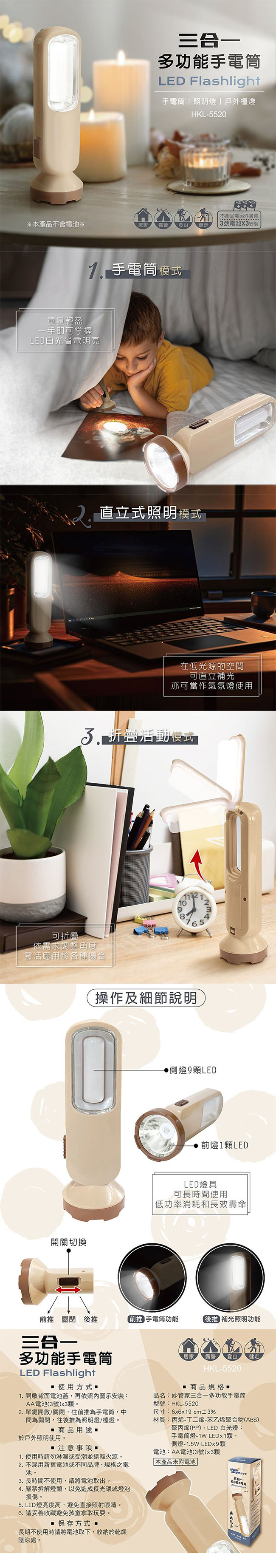妙管家 三合一多功能手電筒 HKL-5520 ■ 手電筒、照明燈、戶外檯燈,三種模式 ■ 使用LED白光,省電明亮 ■ 活動式照明燈,可置於檯面上作為檯燈使用 ■ 居家、戶外露營、登山、健走各種休閒活動與環境皆方便攜帶使用