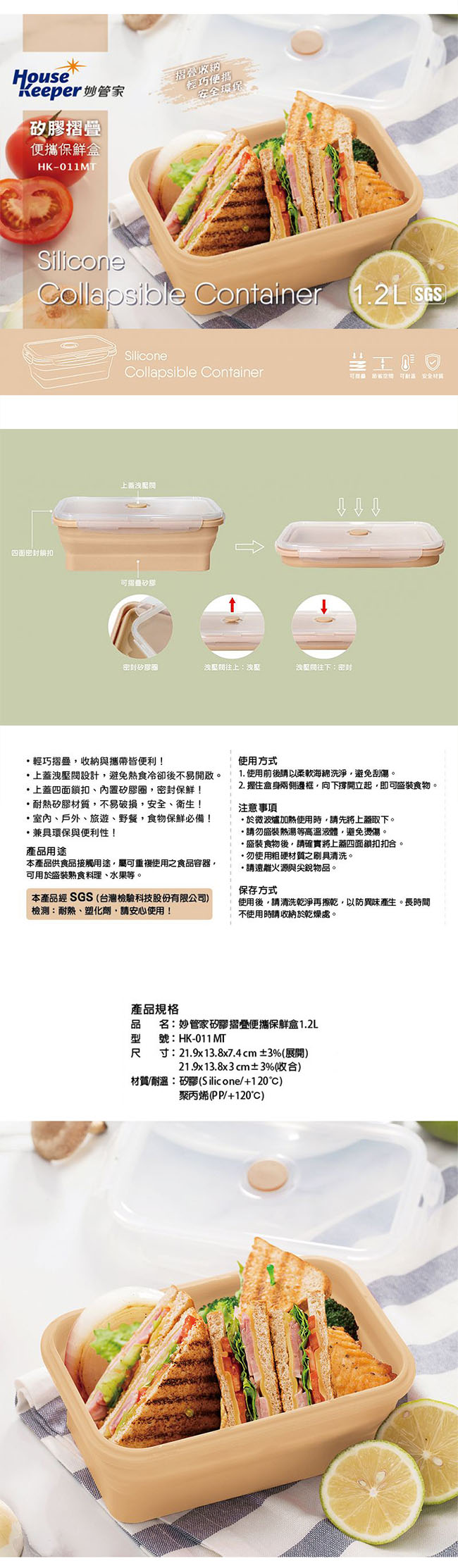 妙管家 矽膠摺疊便攜保鮮盒1.2L HK-011MT ■ 輕巧折疊,收納與攜帶皆便利 ■ 上蓋洩壓閥設計,可避免熱食冷卻後不易開啟 ■ 上蓋四面鎖扣,內置矽膠圈,密封保鮮 ■ 耐熱矽膠材質,不意破損,安全衛生 ■ 室內、室外、旅遊、野餐,食物保鮮必備 ■ 兼具環保與便利性
