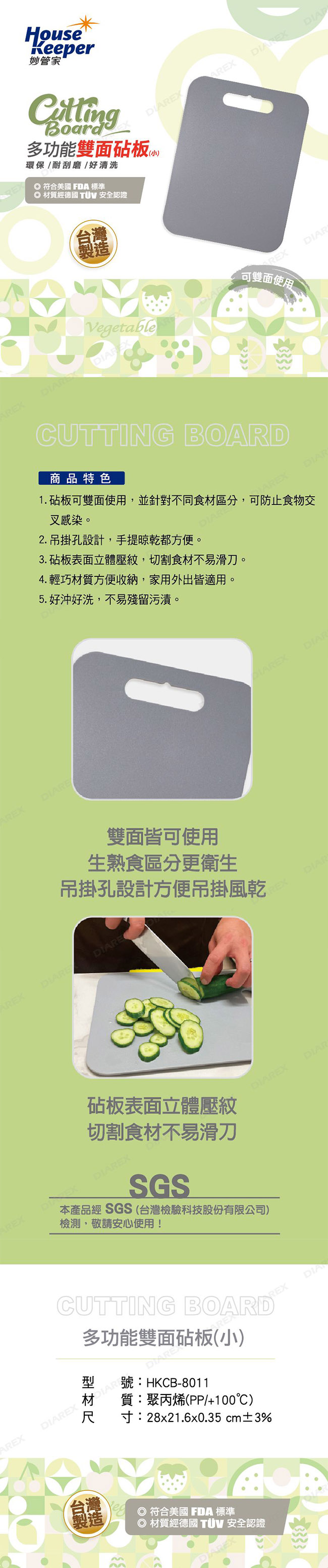 妙管家 多功能雙面砧板(小) HKCB-8011 台灣製 ■ 砧板可雙面使用,並針對不同食材區分,可防止食物交叉感染 ■ 吊掛孔設計,手提吊掛都方便 ■ 砧板表面立體壓紋,切割食材不易滑刀 ■ 輕巧材質方便收納,家用外出皆適用 ■ 好沖好洗,不易殘留污漬