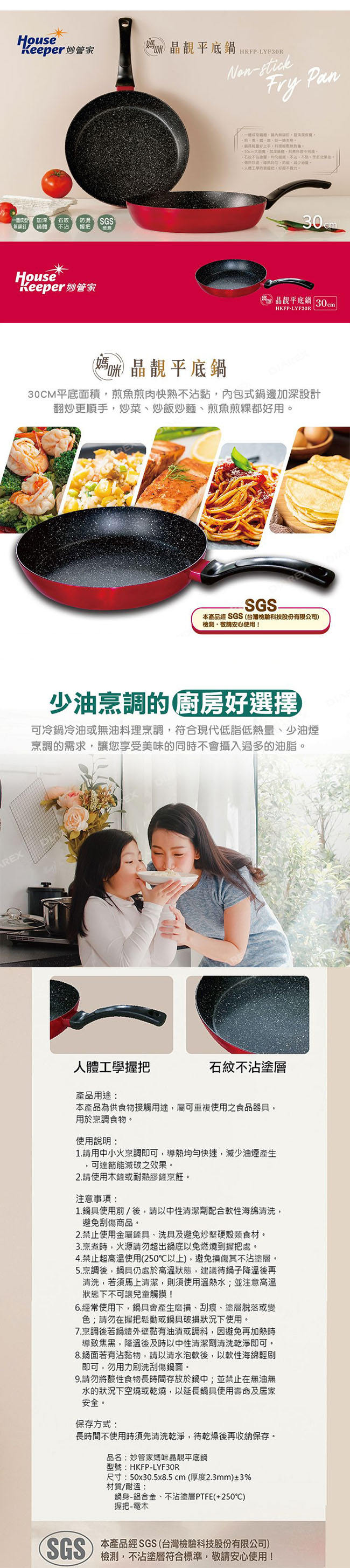妙管家 媽咪晶靚平底鍋30CM(無蓋) HKFP-LYF30R ■ 一體成形壓鑄鍋體,鍋內無鉚釘,易清潔保養 ■ 石紋塗層,均勻細膩,不沾、不黏,烹飪效果佳 ■ 一鍋多用,煎、煮、悶、燉、炒;鍋具輕量好上手,料理輕鬆無負擔 ■ 30cm大寬面、加深鍋體,煎煮料理不飛濺 ■ 傳熱快速、導熱均勻,節能、減少油量,料理輕鬆、美味健康 ■ 人體工學防燙把手,好握不費力