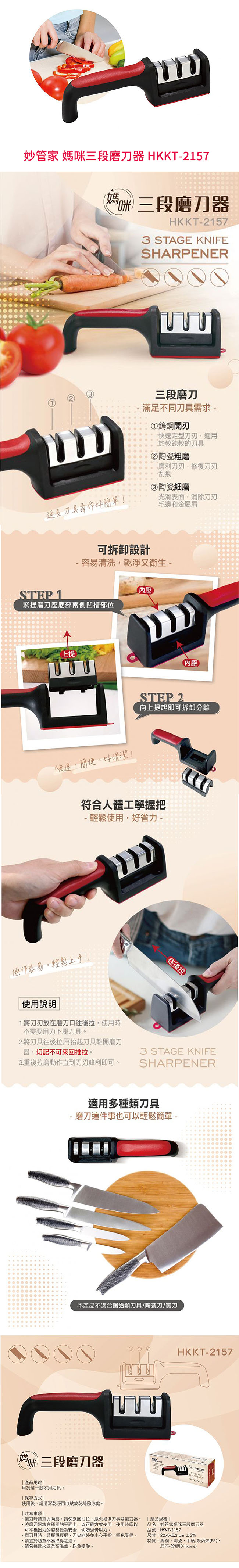 妙管家 媽咪三段磨刀器 HKKT-2157 ■ 三檔不同精磨模式:開刃/粗磨/細磨 ■ 可拆卸清潔,快速、簡便、衛生 ■ 底部穩固貼合桌面 ■ 符合人體工學握把 ■ 適合多種類刀具(不適合:鋸齒類刀具、陶瓷刀、剪刀)