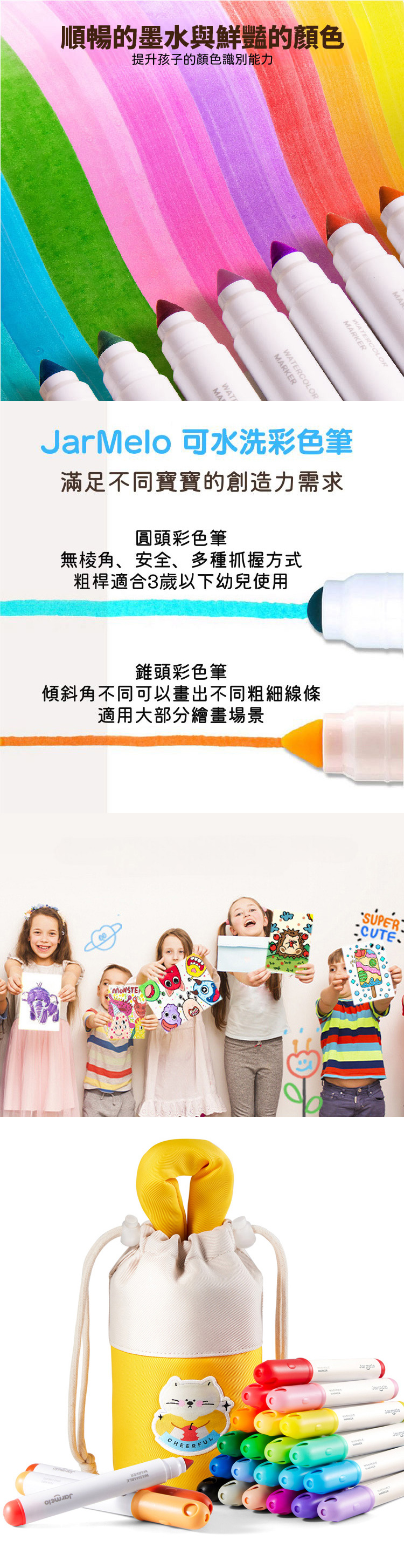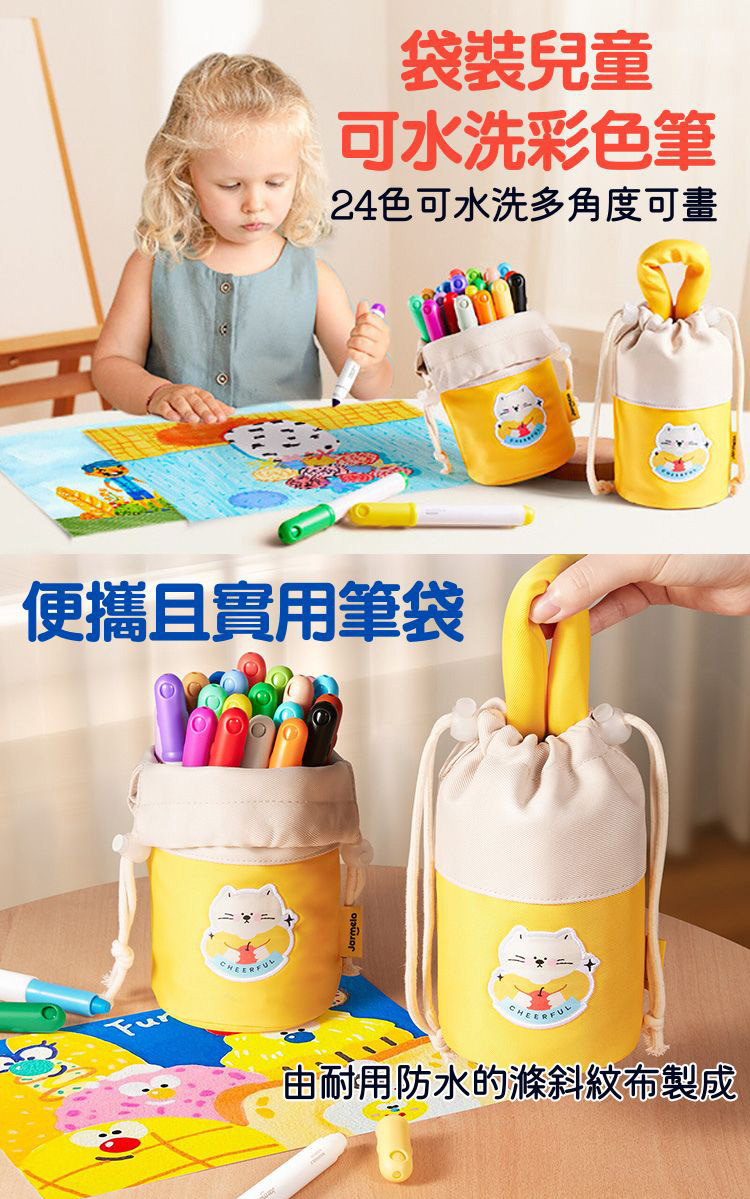 【品名】袋裝兒童可水洗彩色筆(24色) 【材質】植物性染料、塑膠 【年齡】3歲以上 【尺寸】10 x10 x17公分(含提把全長約25公分) 【重量】400 公克 【產地】中國 【安全標章】歐盟CE,美國AP