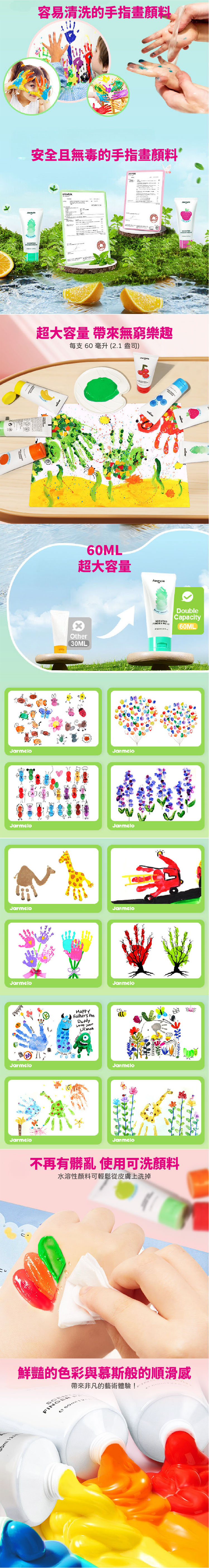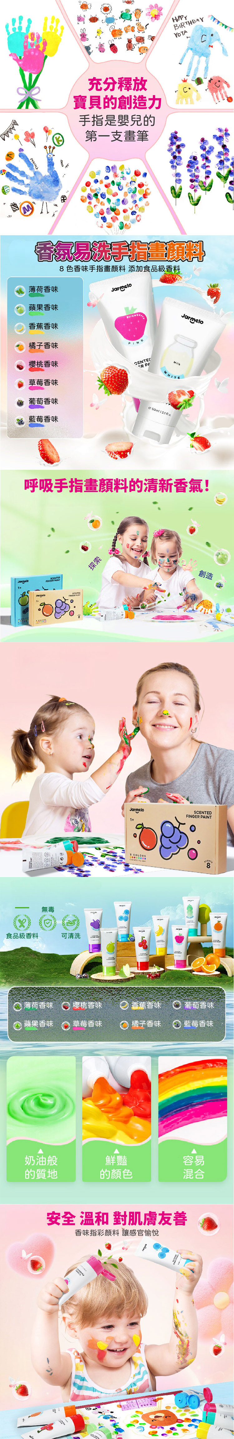 【品名】香氛易洗手指畫顏料(可水洗8色) 【材質】植物性染料、塑膠(軟管) 【年齡】1歲以上 【尺寸】26 X14.2 X3.8公分 【重量】592 公克 【產地】中國 【安全標章】CE, AP 【BSMI】M33851