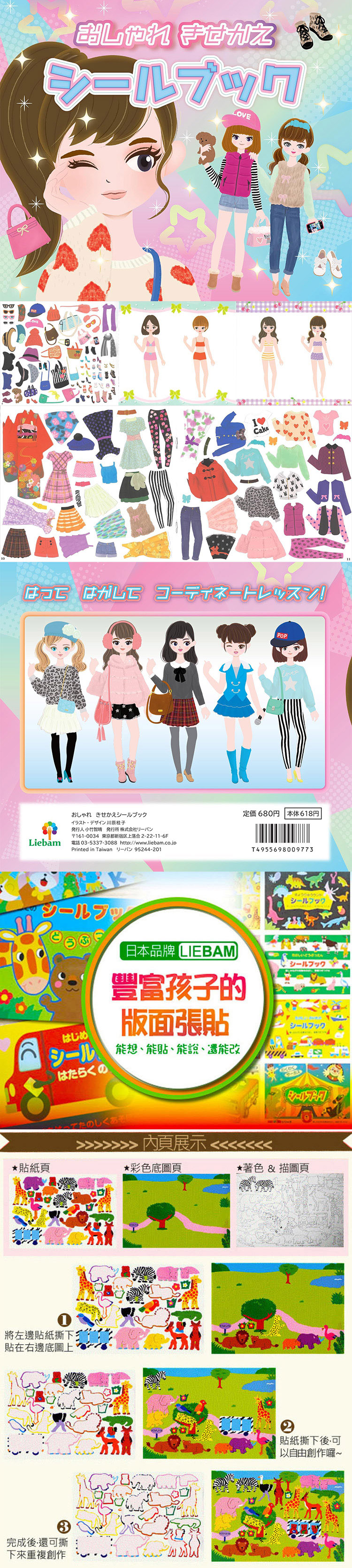 品名:日本【Liebam】重複貼紙畫冊(換裝版)-時尚換裝 規格:約20.7*18*0.3 cm 重量(含包裝):約100g 頁數:共18頁(4頁貼紙,6頁彩色襯紙,4頁著色頁) 貼紙數量:183張 產地:日本設計品管監製/台灣製造 BSMI許可字號:M34169