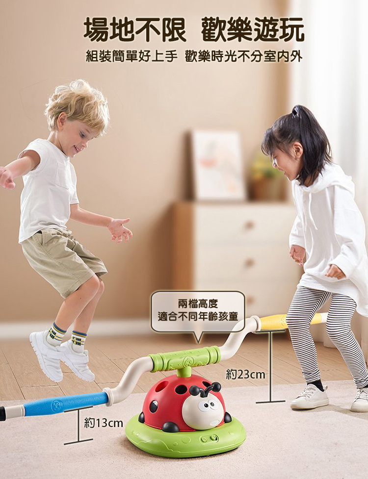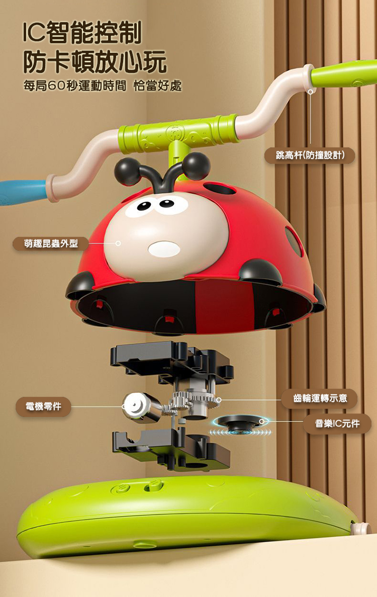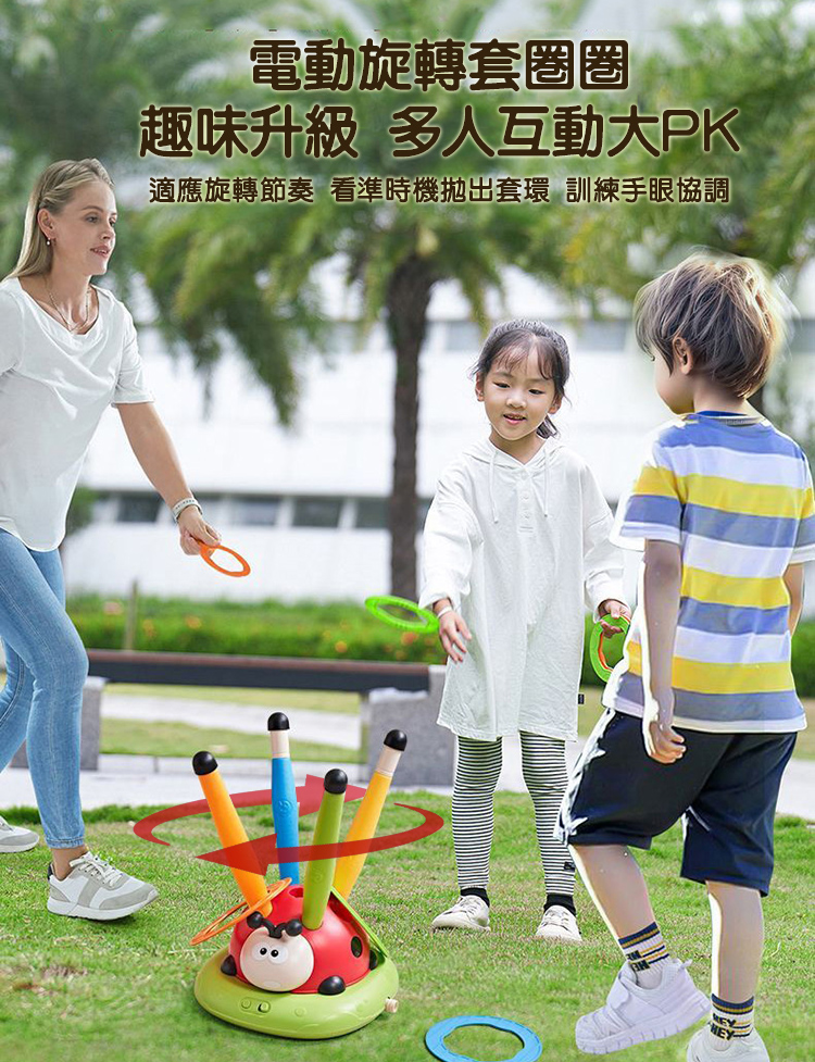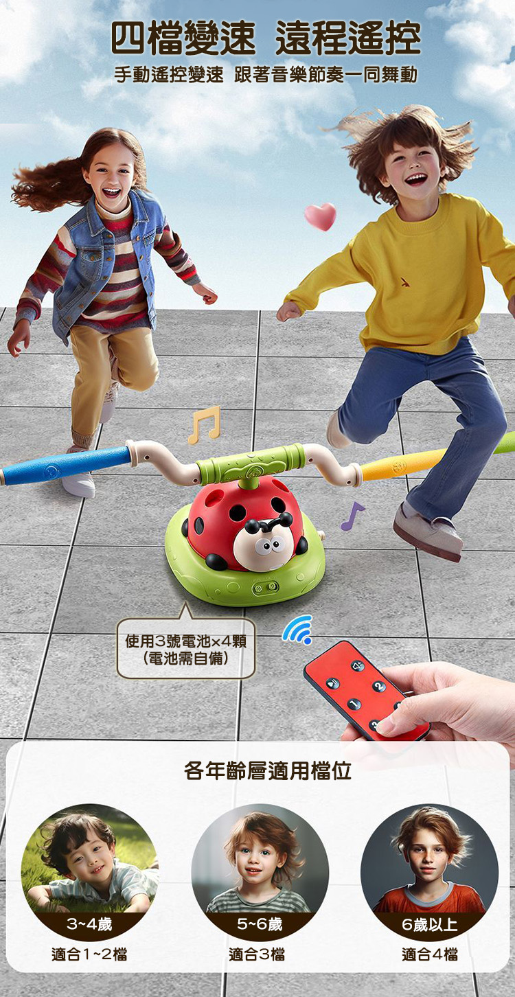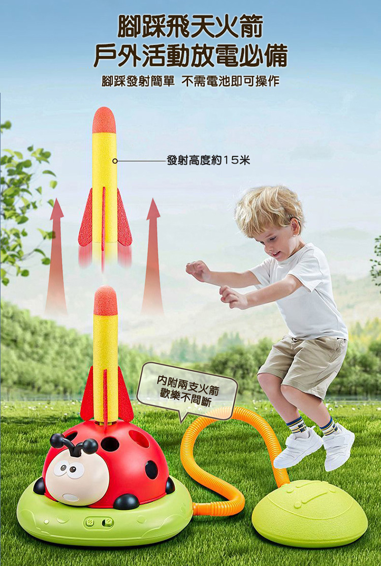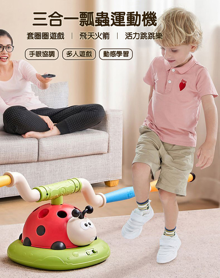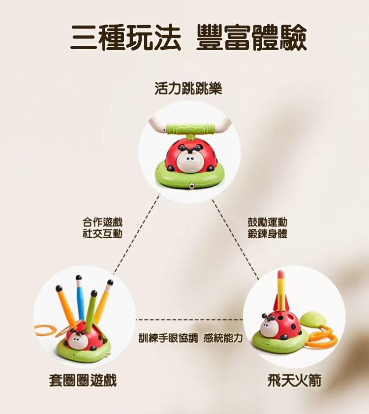 電動跳繩、旅轉套圈圈、飛天火箭一次滿足 音樂瓢蟲運動機結合三種玩法,簡單自由切換遊戲 可遙控四檔變速及暫停模式,趣味玩法大升級 音量可依環境需求搖控調整大小聲及靜音 電動跳繩有兩檔高度四檔調速,適合各年齡孩童遊玩 腳踩飛天火箭射程遠,不須電池即可操作 EVA火箭筒材質柔軟無危險性,是適合小朋友的安全玩具 組裝簡單,室內戶外皆可快樂遊玩 附2支火箭+12個套圈圈