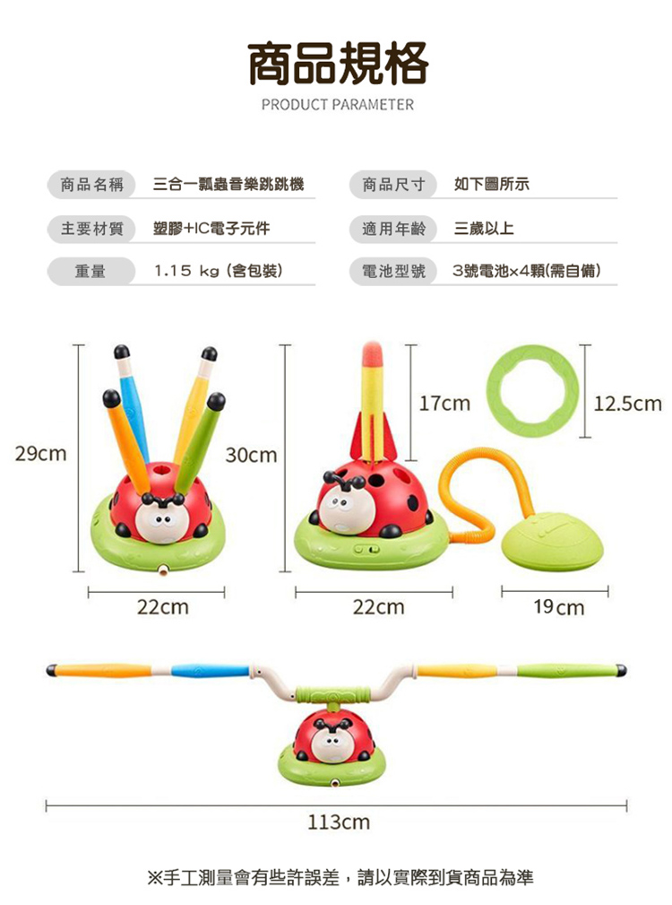 品名: 三合一可調速瓢蟲運動機/親子互動(電動跳繩/旅轉套圈圈/飛天火箭) 適用年齡: 3歲以上 材質: 塑膠、電子元件 電力需求: 3號電池x4(需自備) 包裝尺寸: 30.5x26.5x13cm 重量: 1150g 產地: 中國 商檢證號: M74899