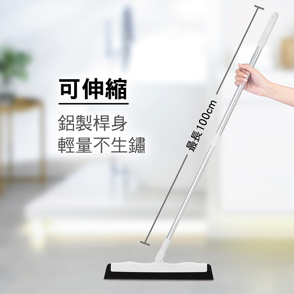 數量:掃把x1 規格:掃把頭34cm[寬] (±2%)、伸縮桿70cm[未伸長]/101cm[伸長總長] (±2%) 主要成分:鋁管、塑膠(PP、EVA) 用途:刮除水痕、掃除毛髮 使用方法:取出掃把頭及桿身,將桿身與掃把頭組裝拴緊後,可刮除地板水漬或掃除地板毛髮 ※另可參照商品販售網頁之說明 原產地:中國 有效期間:5年(未拆封) 保存方法:請置於陰涼乾燥處,避免曝曬以免塑膠變質