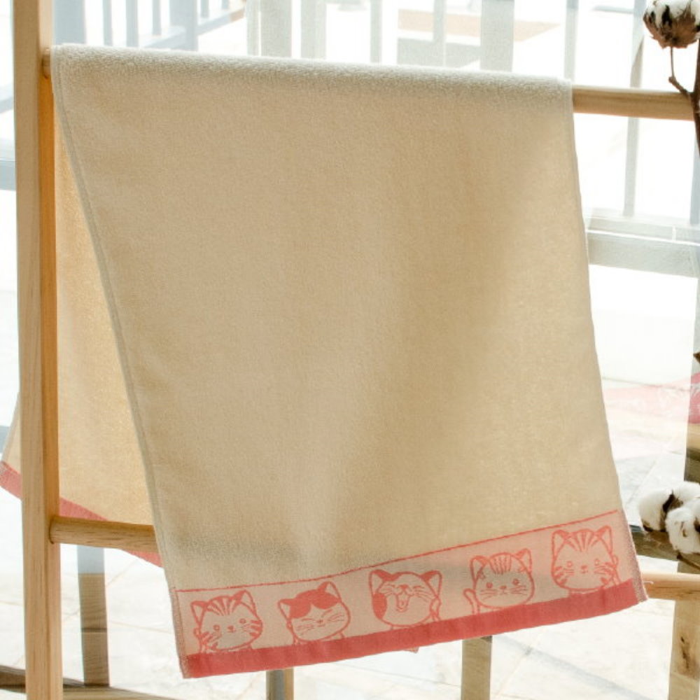 有機棉.福氣Q貓咪緞條毛巾-粉色緞(2條組)【台灣興隆毛巾製】