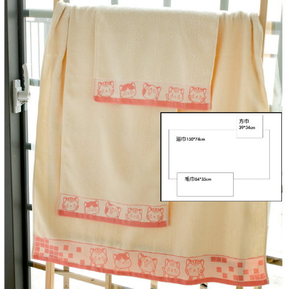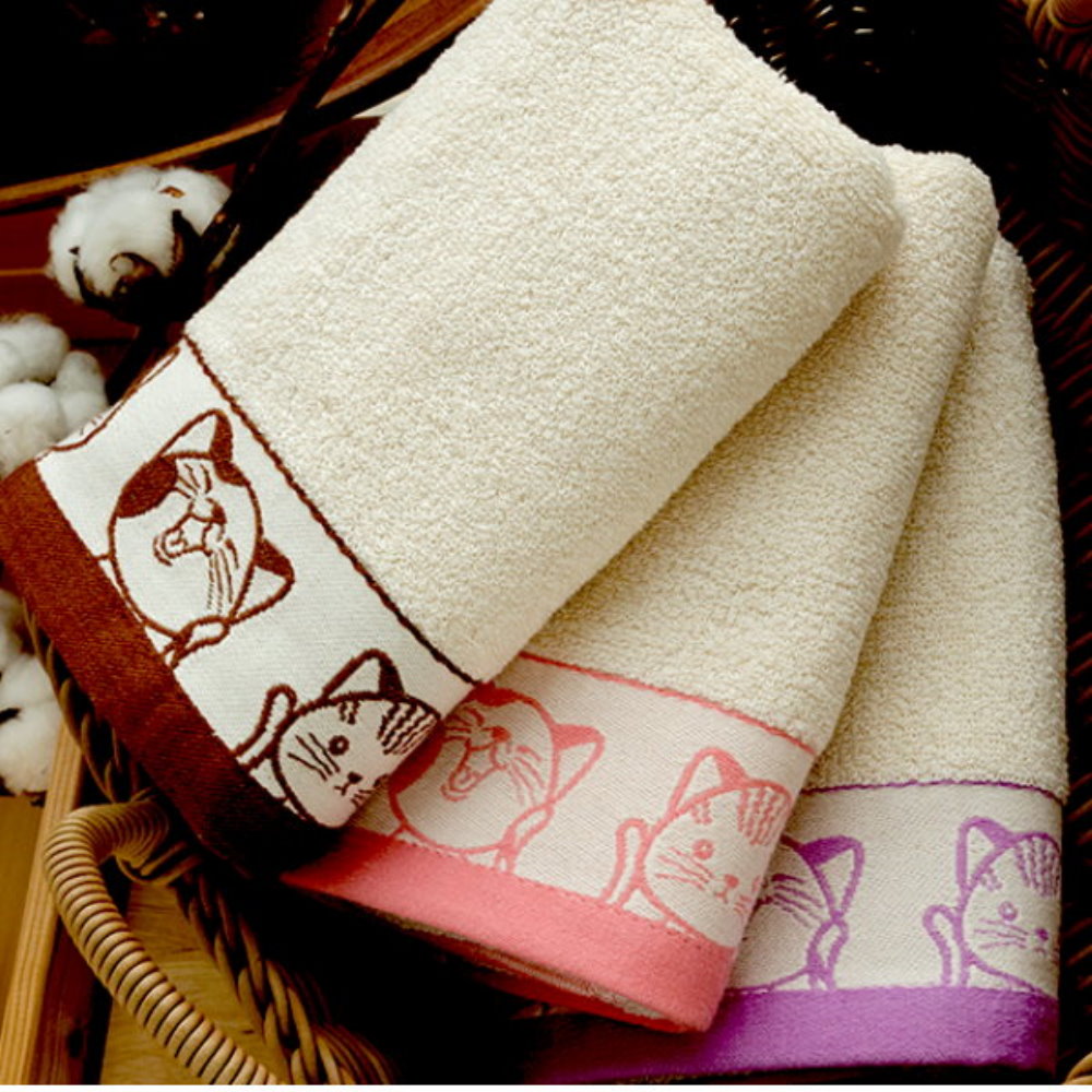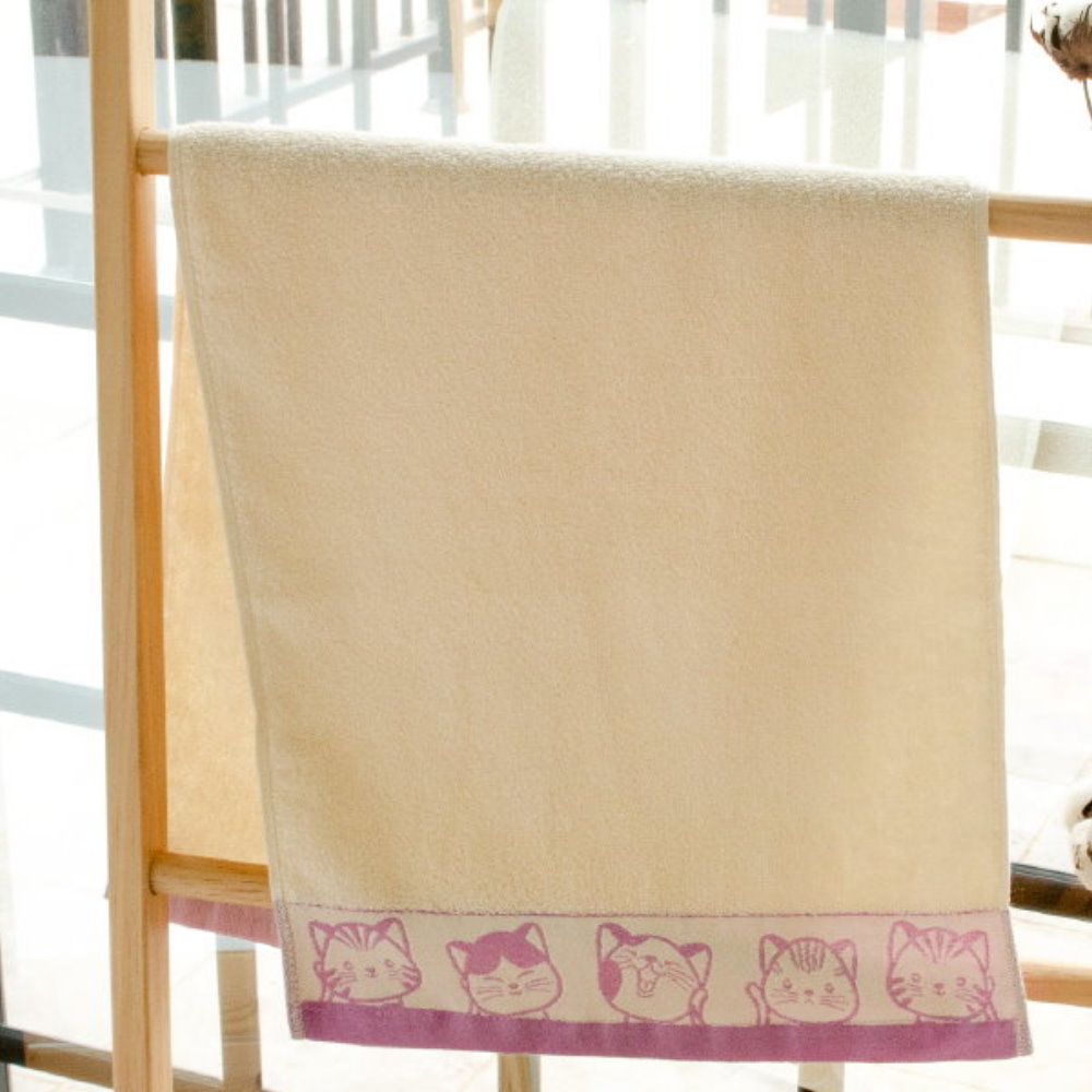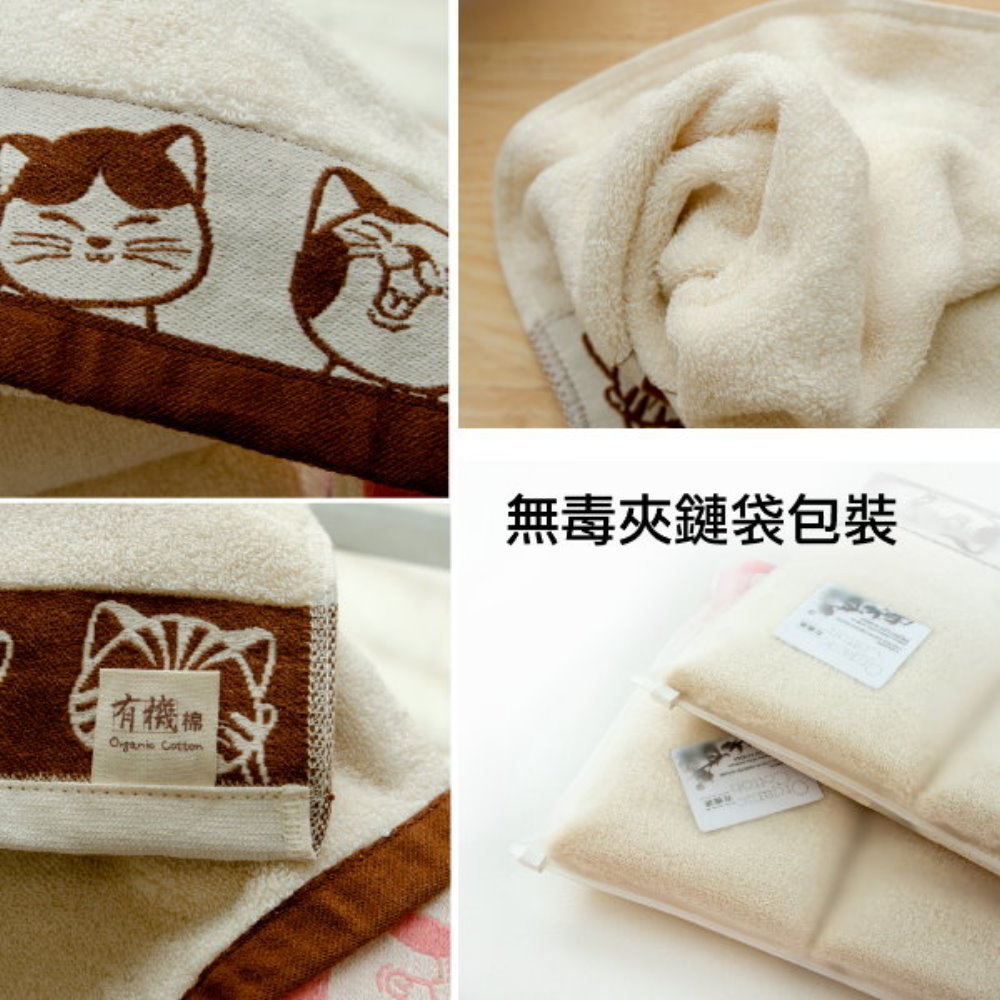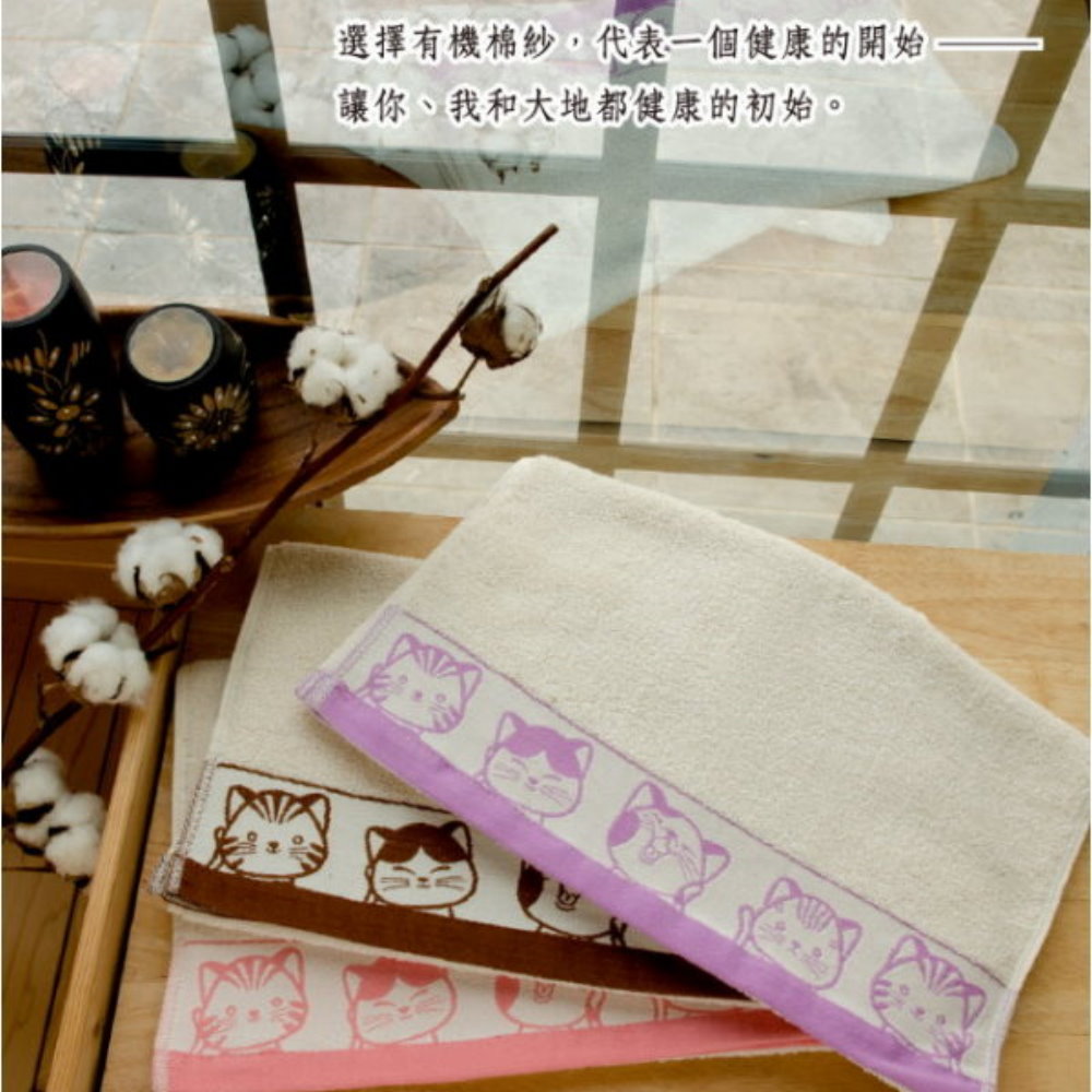 有機棉.福氣Q貓咪緞條毛巾-紫色緞(2條組)【台灣興隆毛巾製】