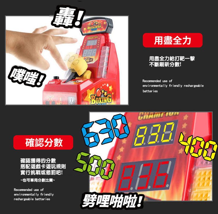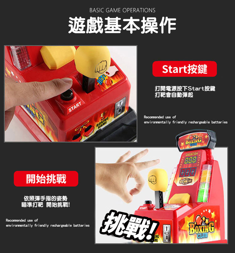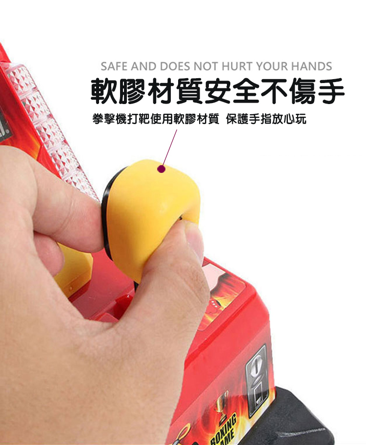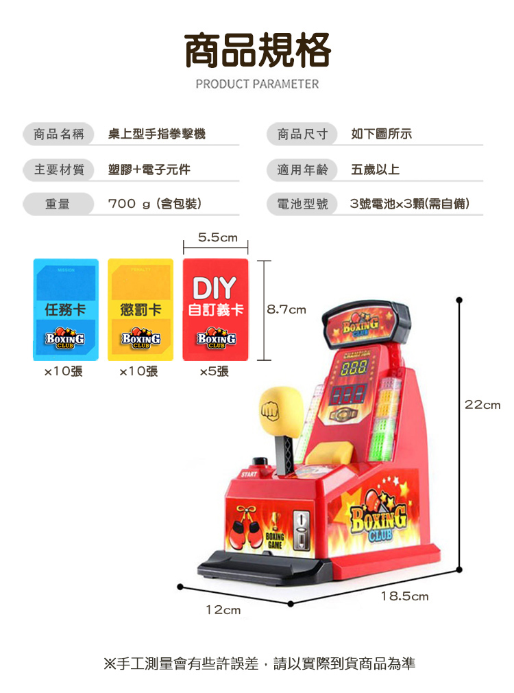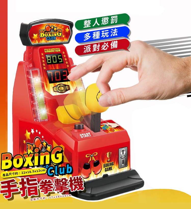 品名:桌上型手指拳擊機/彈指桌遊/指力格鬥遊戲機~英文版(派對團康/親子互動玩具) 適用年齡:5歲以上 材質:塑膠、電子元件 電池:3號電池3顆(需自備) 包裝尺寸:17x20x28 cm 重量:700 g BSMI商檢字號:M55080