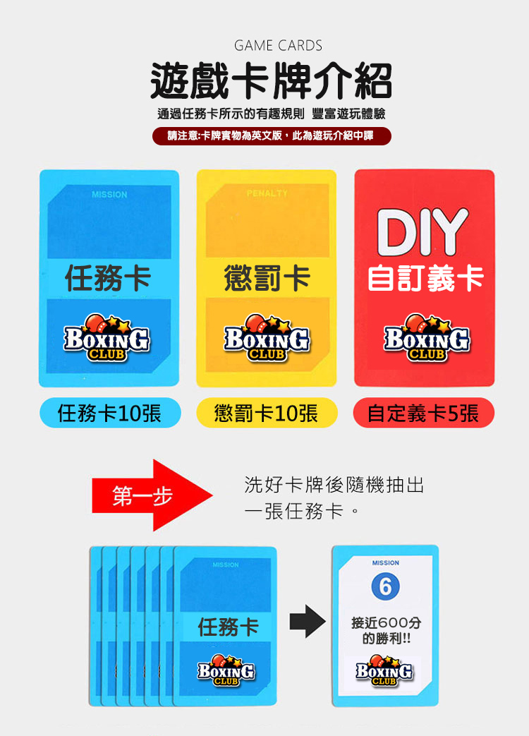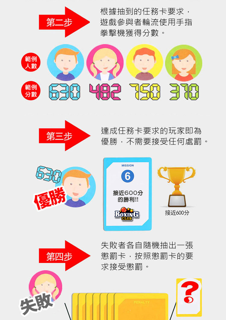 遊戲說明: 1. 任務卡洗牌,隨機抽出一張任務卡 2. 根據抽到的任務卡要求,參賽者輪流彈手指拳擊機,並記錄分數 3. 達成任務的參賽者為優勝者,不需懲罰 (例如:最接近600分的為優勝者) 4. 失敗者隨機抽出一張懲罰卡,依內容接受懲罰