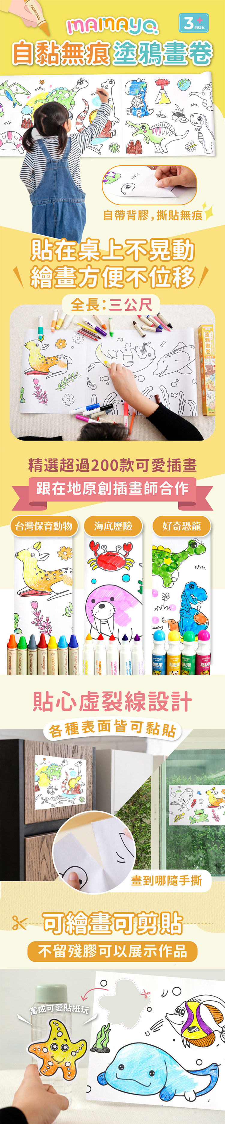 品名:【mamayo】300cm自黏無痕塗鴉畫卷/可貼壁塗鴉捲紙2入組(海底歷險+台灣動物) 適用年齡:1歲以上 保存期限:無 包裝尺寸:36cm*8cm*4cm 規格: 300*30cm 重量:260g 材質:道林紙 用途:塗鴉、彩繪、美術、美勞、畫紙、創作、寫生 產地:中國(台灣原廠監製)