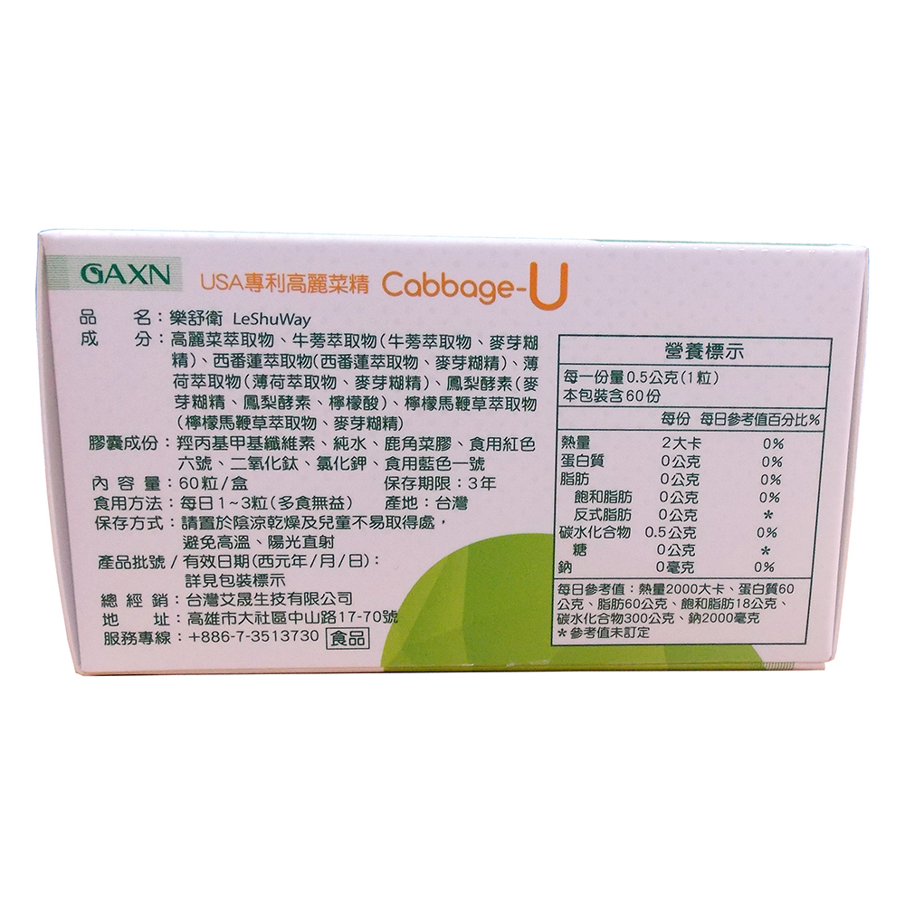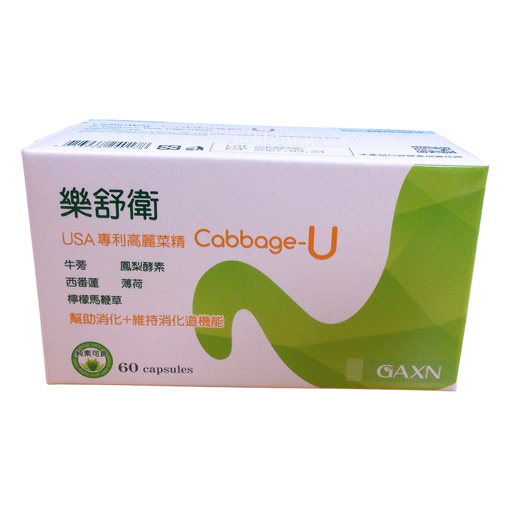 【產品特色】 USA 美國專利高麗菜精 Cabbage-U。 幫助消化+ 維持消化道機能。 純素可食。 檢驗合格,安心保障。