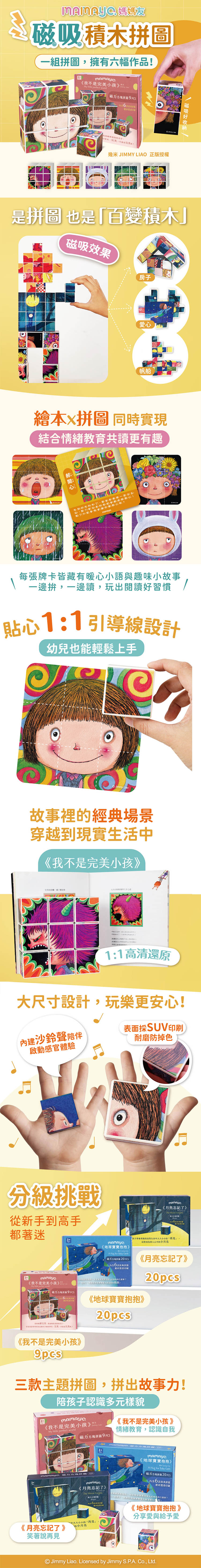 【幾米正版授權款】 一款就有六幅拼圖,是拼圖也是積木 mamayo與台灣知名插畫家-幾米合作囉!一款產品:繪本、拼圖、積木同時實現,孩子學習認知同時也潛移默化的提升美學素養,每款拼圖可作出6幅作品,同時也可做為積木/安撫玩具/裝飾品 多種用途。磁力設計與輕盈重量,幼兒也能輕鬆組合更有成就感。
