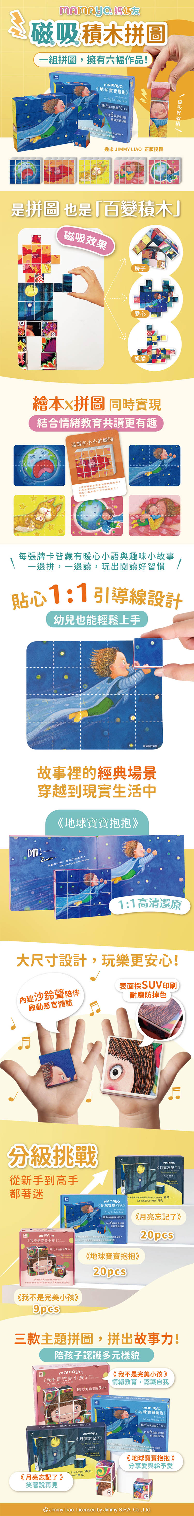 【幾米正版授權款】 一款就有六幅拼圖,是拼圖也是積木 mamayo與台灣知名插畫家-幾米合作囉!一款產品:繪本、拼圖、積木同時實現,孩子學習認知同時也潛移默化的提升美學素養,每款拼圖可作出6幅作品,同時也可做為積木/安撫玩具/裝飾品 多種用途。磁力設計與輕盈重量,幼兒也能輕鬆組合更有成就感。