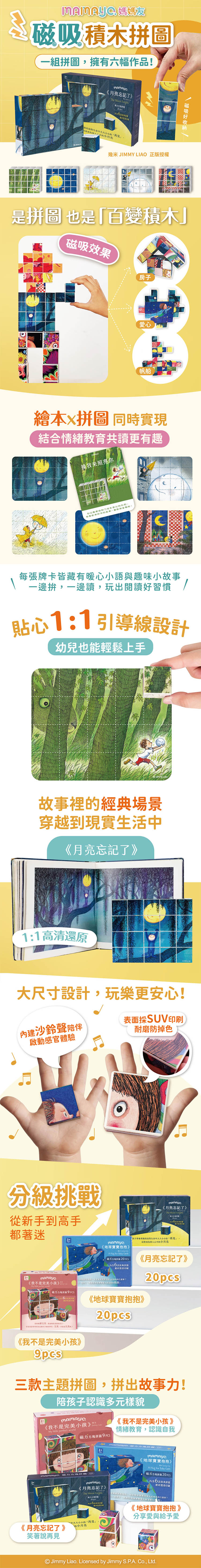 【幾米正版授權款】 一款就有六幅拼圖,是拼圖也是積木 mamayo與台灣知名插畫家-幾米合作囉!一款產品:繪本、拼圖、積木同時實現,孩子學習認知同時也潛移默化的提升美學素養,每款拼圖可作出6幅作品,同時也可做為積木/安撫玩具/裝飾品 多種用途。磁力設計與輕盈重量,幼兒也能輕鬆組合更有成就感。