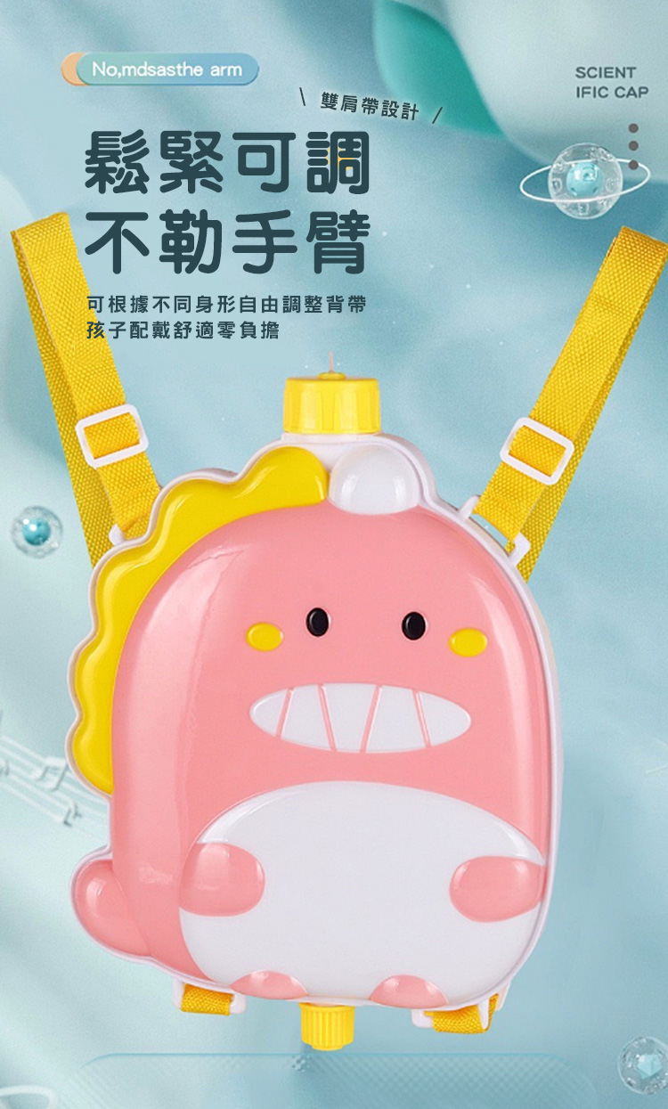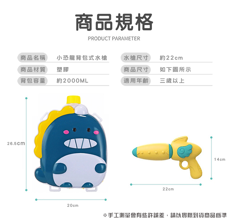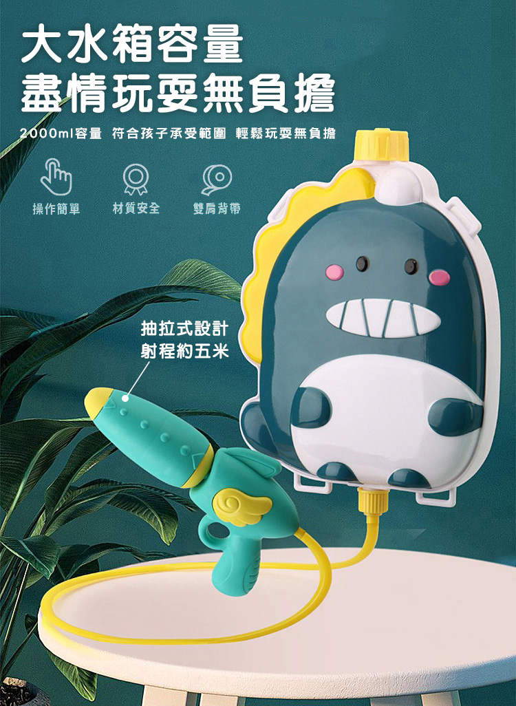 品名:2000ml大容量恐龍造型背包水槍 材質:ABS塑膠 適用年齡:3歲以上 包裝尺寸:33x39.5x9 公分(藍粉二入組) 重量:600 公克 產地:中國 BSMI商檢字號:M55080