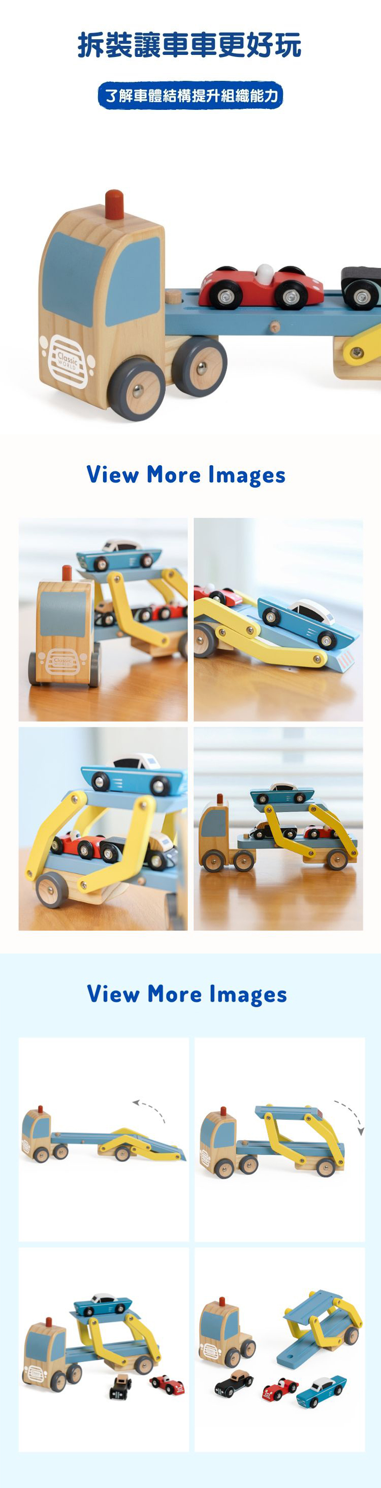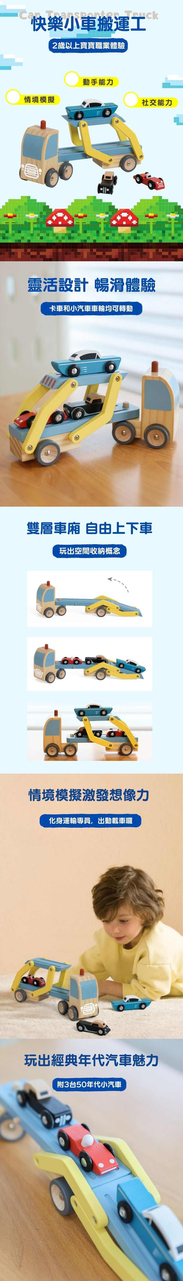 卡車和小汽車車輪均可轉動 上下折疊,體驗卸載裝車技術 車頭可以拆卸,讓孩子了解構造好收納 有益孩子:提升想像力(扮演賽車手、司機等角色),增進語言表達、互動社交 邊玩邊學:空間(上下/前後/左右)、結構理解 通過 歐盟CE認證/英國UKCA認證優質玩具 適合18個月以上寶貝