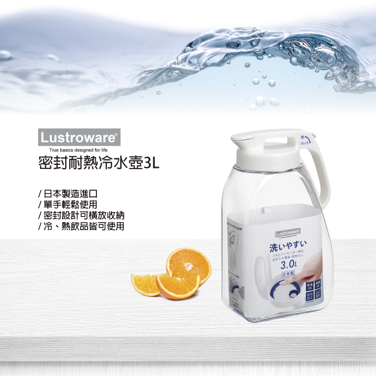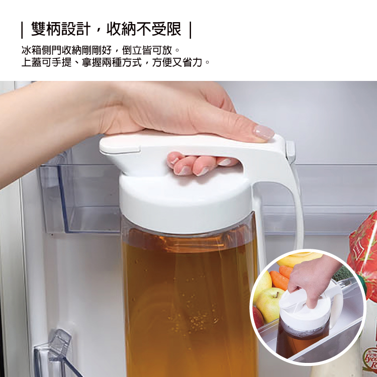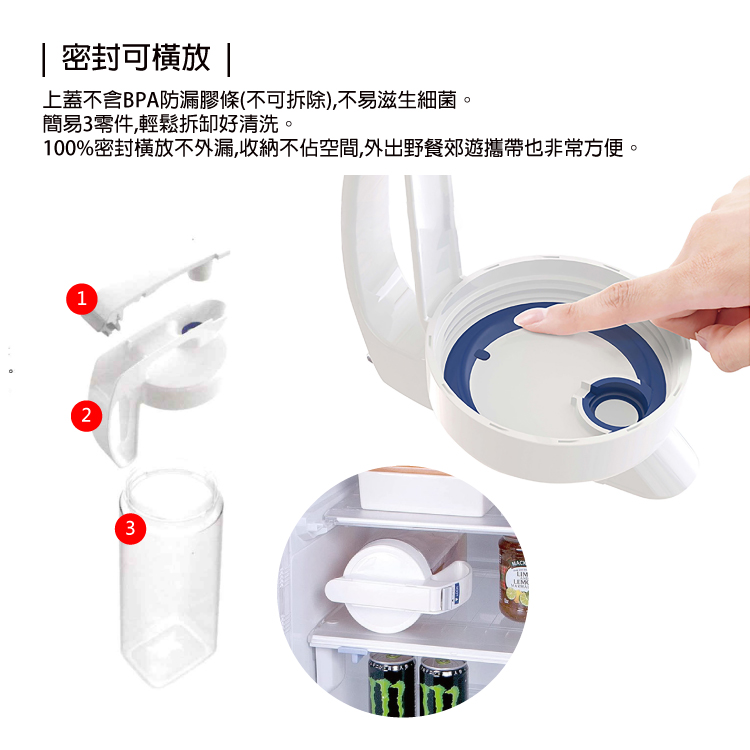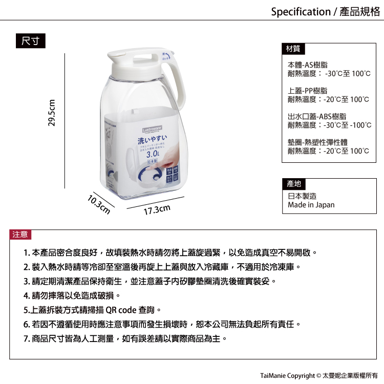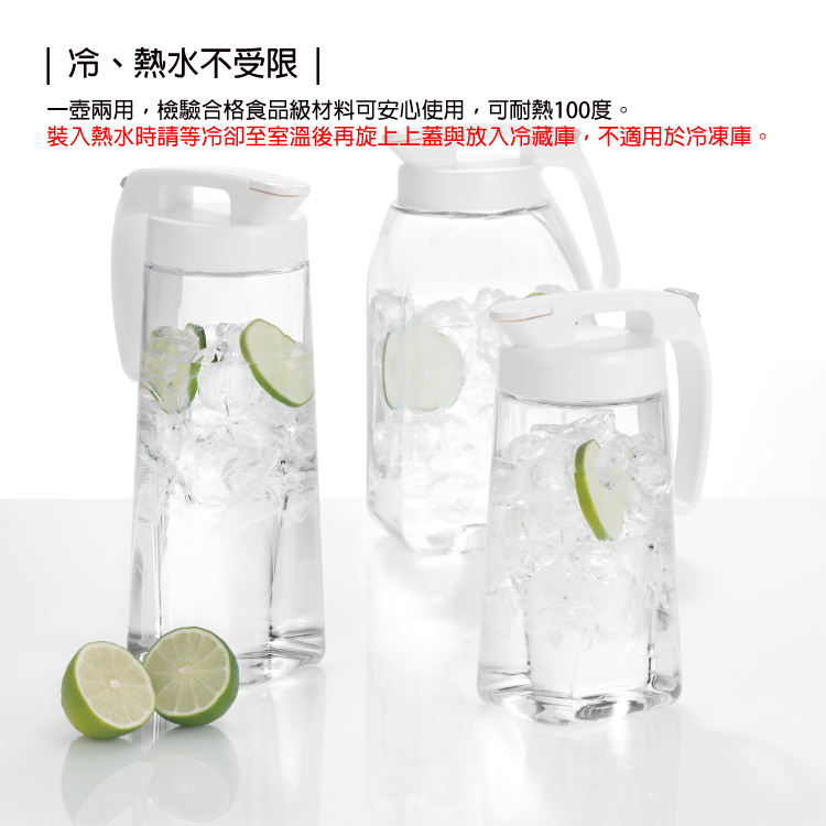 材質:本體--AS樹脂 耐熱溫度:100℃至 -30℃。 上蓋--PP樹脂 耐熱溫度:100℃至 -20℃。 墊圈--矽膠 耐熱溫度:140℃至 -30℃。 特點: 1、檢驗合格食品級材料可安心使用。 2、特殊矽膠撥水加工,瓶口廣口設計,容易清洗。 3、可填裝熱水,放置於冰箱輕巧方便。 4、特殊防漏設計,可直立或橫放不受空間限制。 5、採用不凸出壺身把手設計,省空間,大容量。