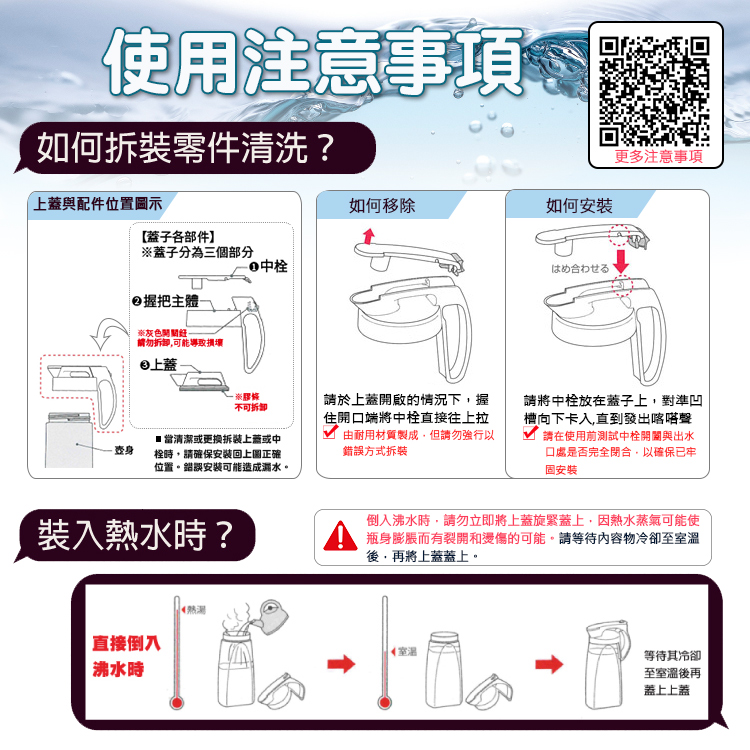 注意事項: 1、本品密合度良好,故填裝熱水時請勿將上蓋旋過緊以免造成真空,不易開啟。 2、熱水請冷卻後再放入冷藏庫。 3、本商品不適用於冷凍庫。 4、上蓋拆裝方式請掃描 QR code 查詢。