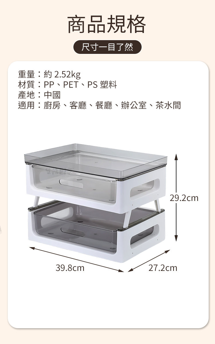 1.尺寸:約寬39.8*深27.2*高29.2cm(疊加時) 2.材質:PP、PET、PS塑料 3.重量:約2.52kg/組 4.產地:中國 5.顏色:白色 6.適用:廚房、客廳、餐廳、辦公室、茶水間