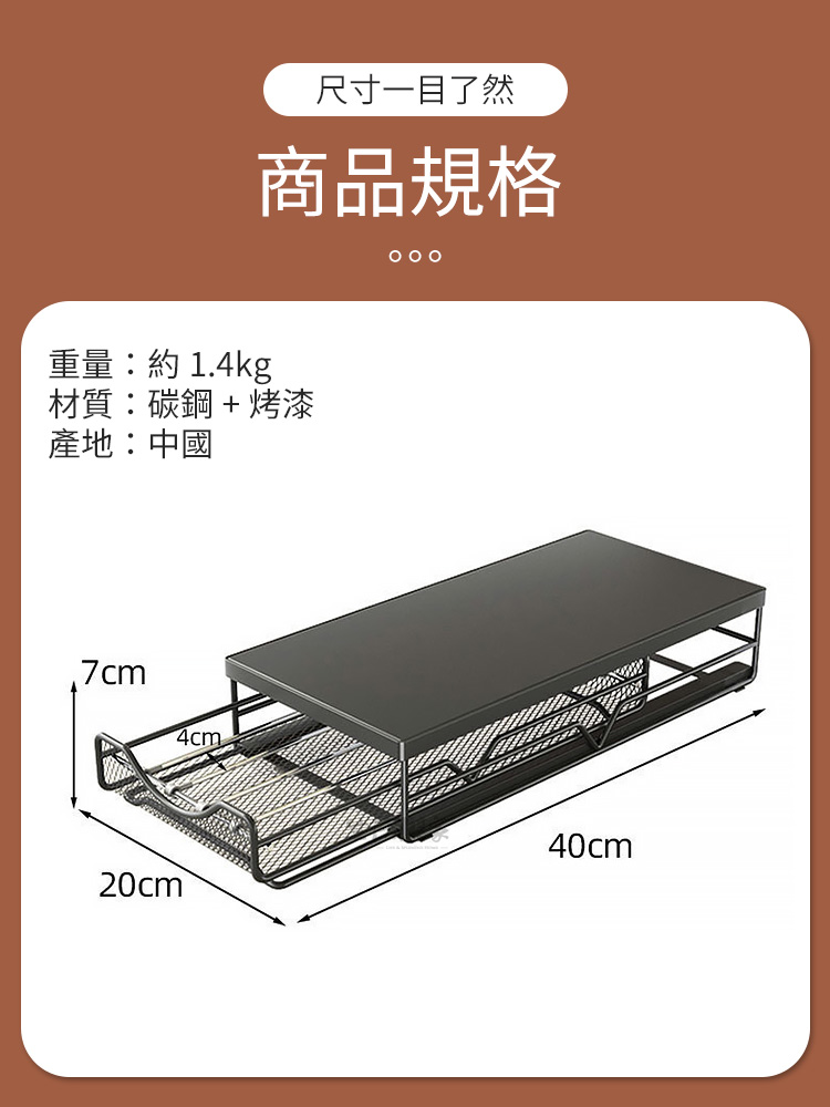1.尺寸:約寬20*深40*高7cm 2.材質:碳鋼+烤漆 3.重量:約1.4kg/組 4.產地:中國 5.顏色:黑色 6.收納:咖啡用品、咖啡膠囊、茶包、刀叉匙筷等 7.適用:廚房、櫥櫃、吧檯、辦公室、茶水間等