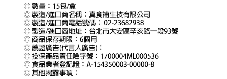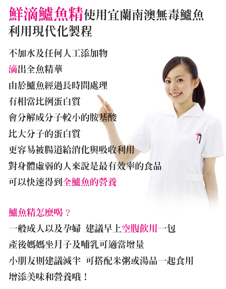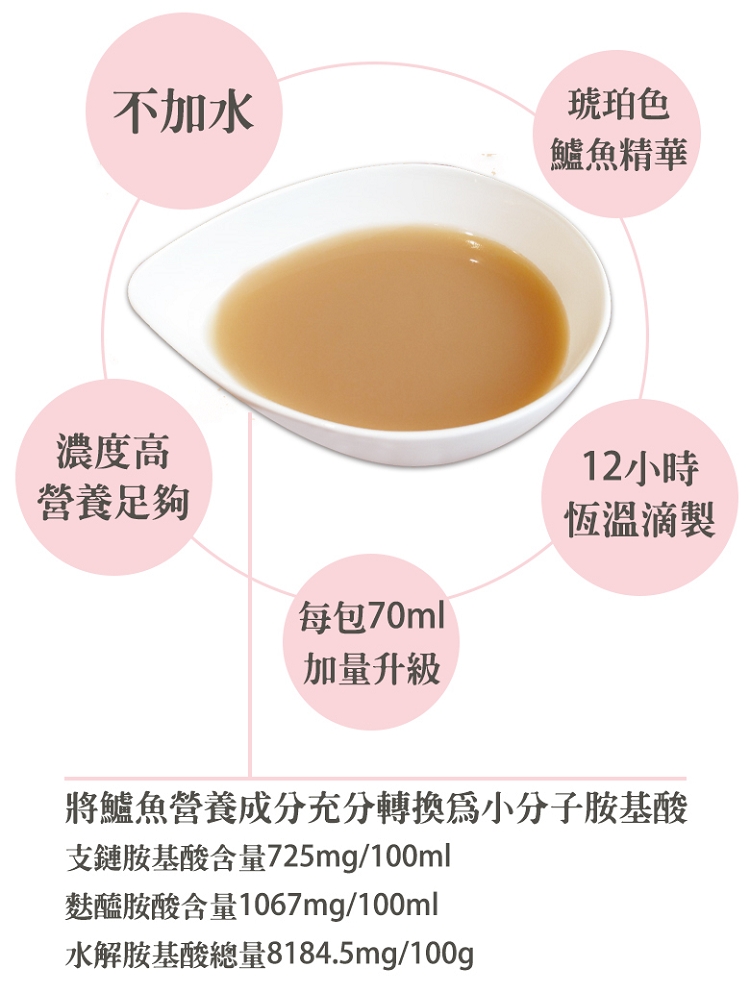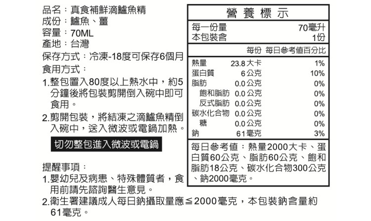 品名:真食補鮮滴(有薑)鱸魚精 商品重(容)量:70ml/包,15包/盒 成份:鱸魚、薑 產地:台灣 本包裝鈉含量約61毫克