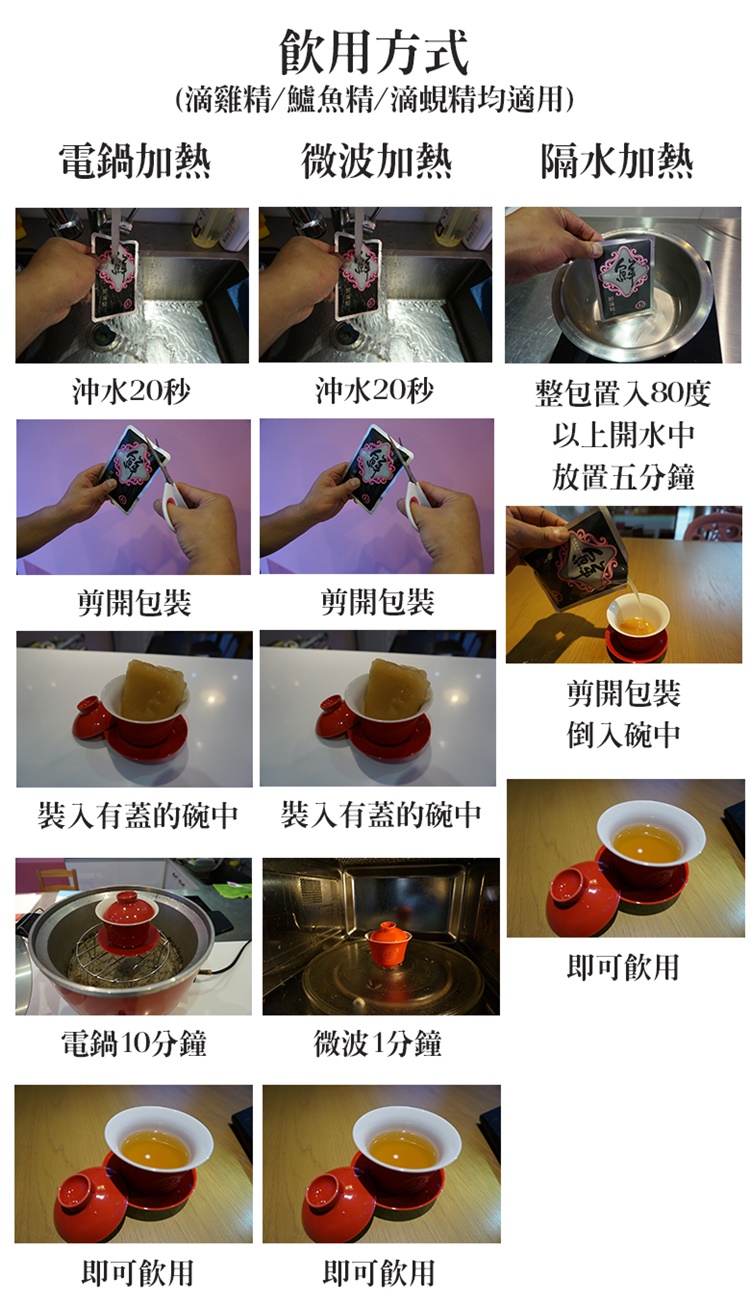 保存方式:冷凍-18度可保存6個月 食用方式: 1. 整包置入80度以上熱水中,約5分鐘後將包裝袋剪開倒入碗中即可食用。(切勿整包放入持續加熱的滾水) 2. 以冷水沖包裝袋約30秒,待結凍之鱸魚精稍微解凍,剪開包裝,將滴鱸魚精塊倒入碗中,送入微波爐或電鍋加熱。(切勿整包進入微波爐或電鍋)