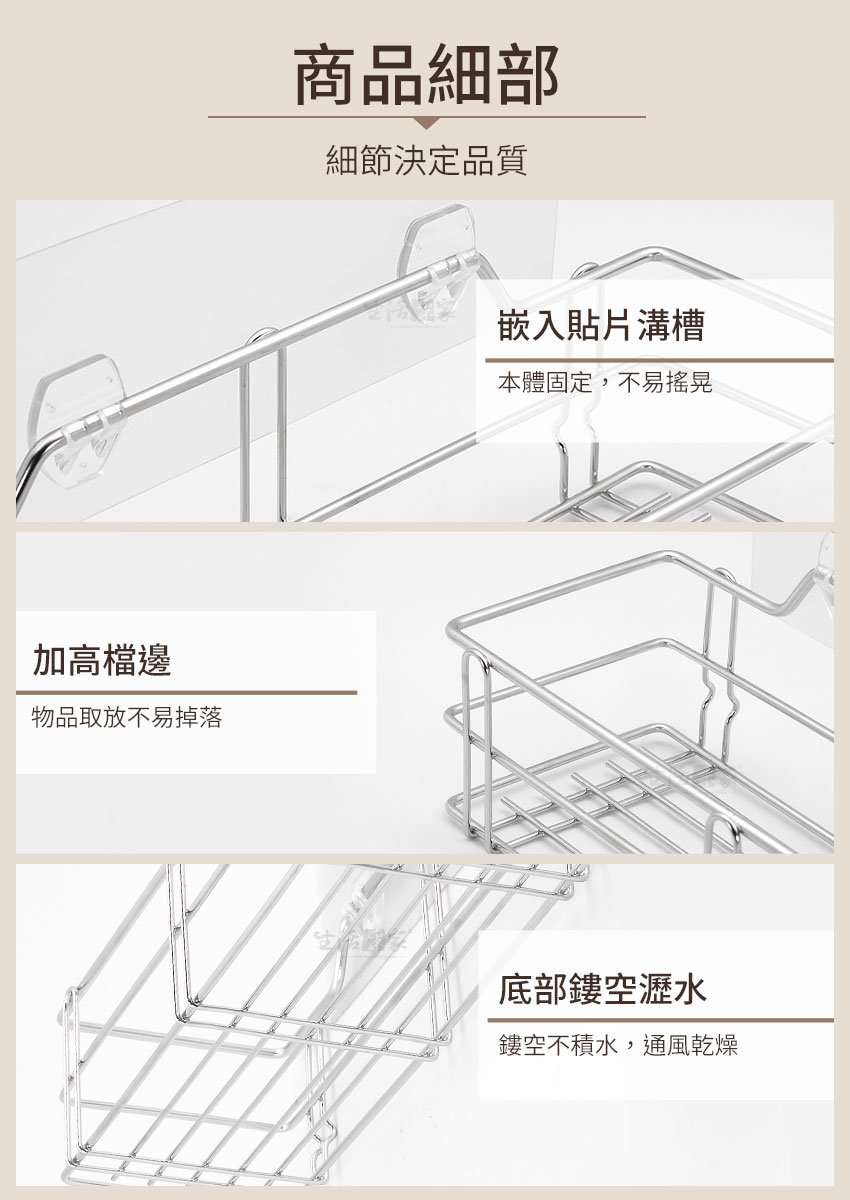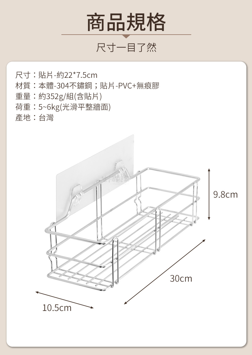 1.尺寸:貼片-約22*7.5cm;本體-約寬30*深10.5*高9.8cm 2.材質:本體-304不鏽鋼;貼片-PVC+無痕膠 3.重量:約352g/組(含貼片) 4.荷重:5~6kg(光滑平整牆面) 5.產地:台灣 6.適用:廚房、衛浴瓶罐