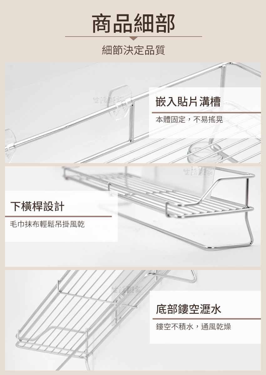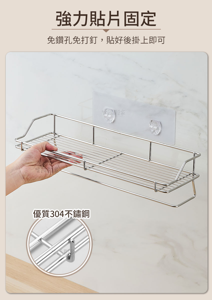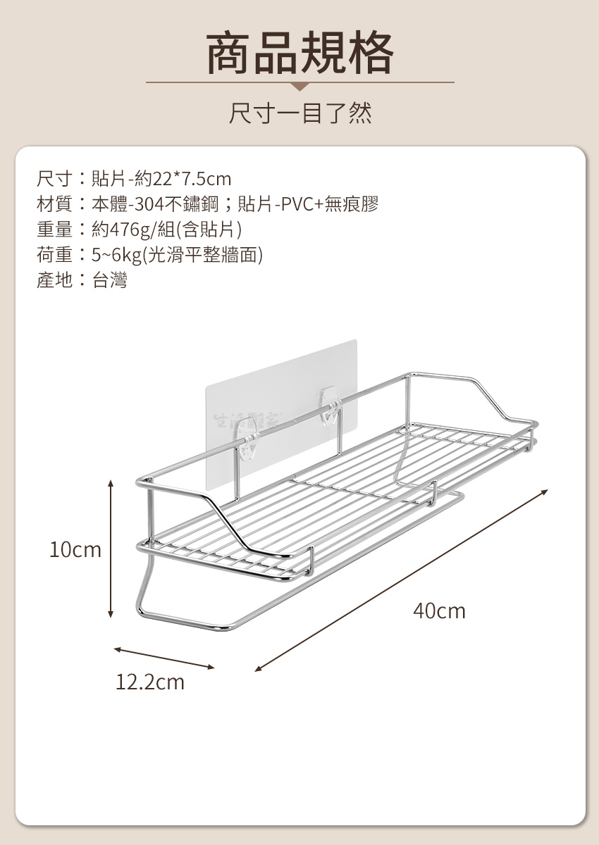 1.尺寸:貼片-約22*7.5cm;本體-約寬40*深12.2*高10cm 2.材質:本體-304不鏽鋼;貼片-PVC+無痕膠 3.重量:約476g/組(含貼片) 4.荷重:5~6kg(光滑平整牆面) 5.產地:台灣 6.適用:廚房、衛浴瓶罐、抹布、毛巾等