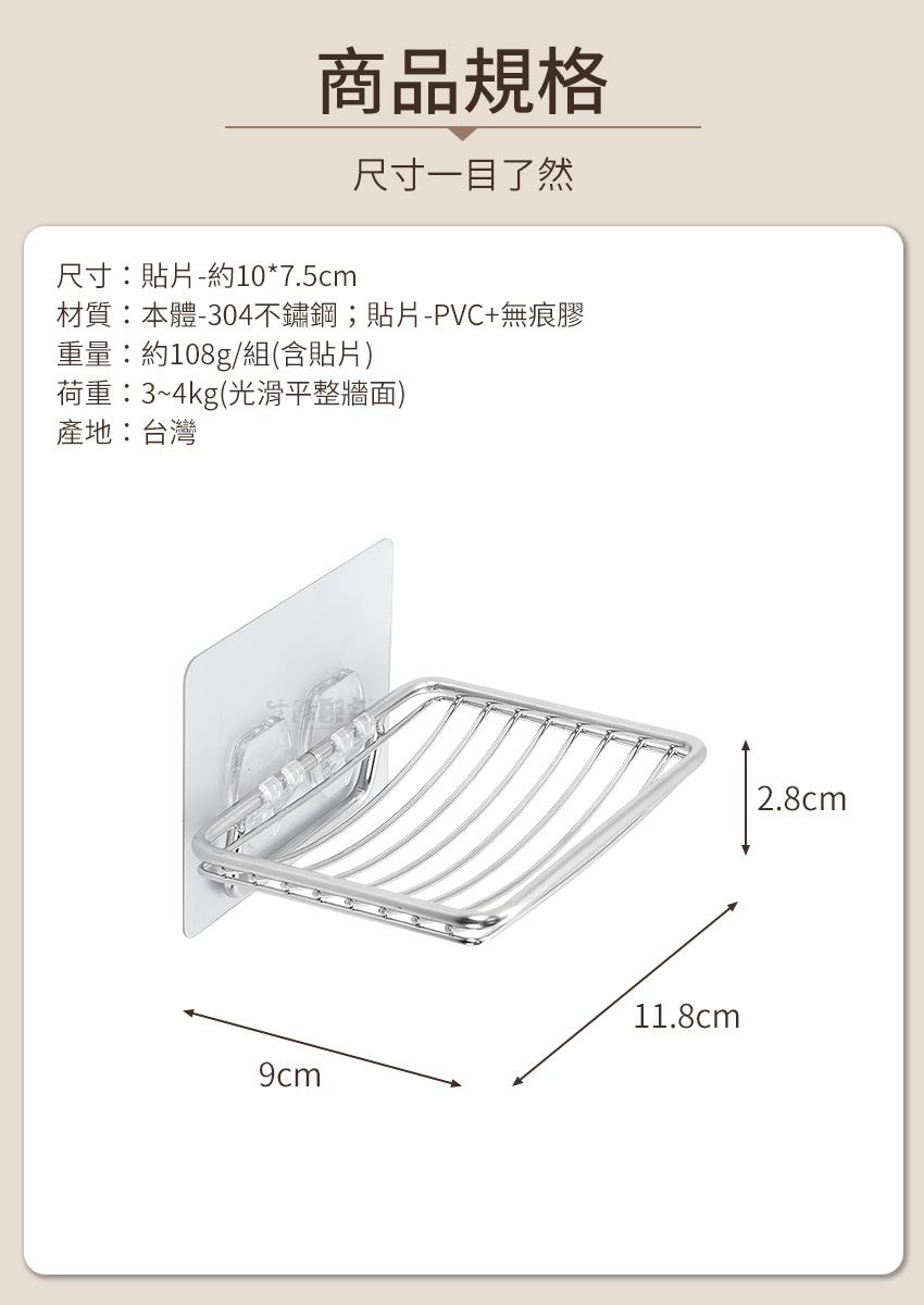 1.尺寸:貼片-約10*7.5cm;本體-約寬11.8*深9*高2.8cm 2.材質:本體-304不鏽鋼;貼片-PVC+無痕膠 3.重量:約108g/組(含貼片) 4.荷重:3~4kg(光滑平整牆面) 5.產地:台灣 6.適用:肥皂、香皂、手工皂等