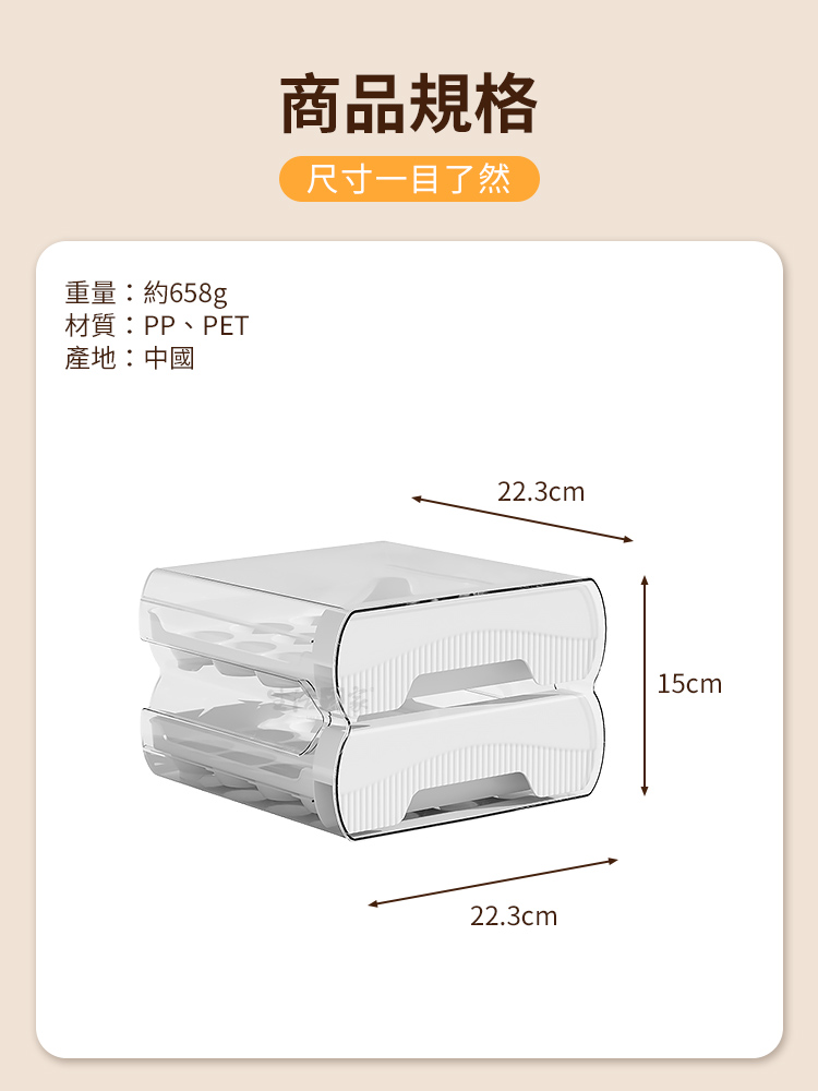 1.尺寸:約長22.3*寬22.3*高15cm 2.材質:PP、PET塑料 3.重量:約658g/組 4.產地:中國 5.顏色:白色 6.商品:抽屜雙層32顆保鮮雞蛋架*2
