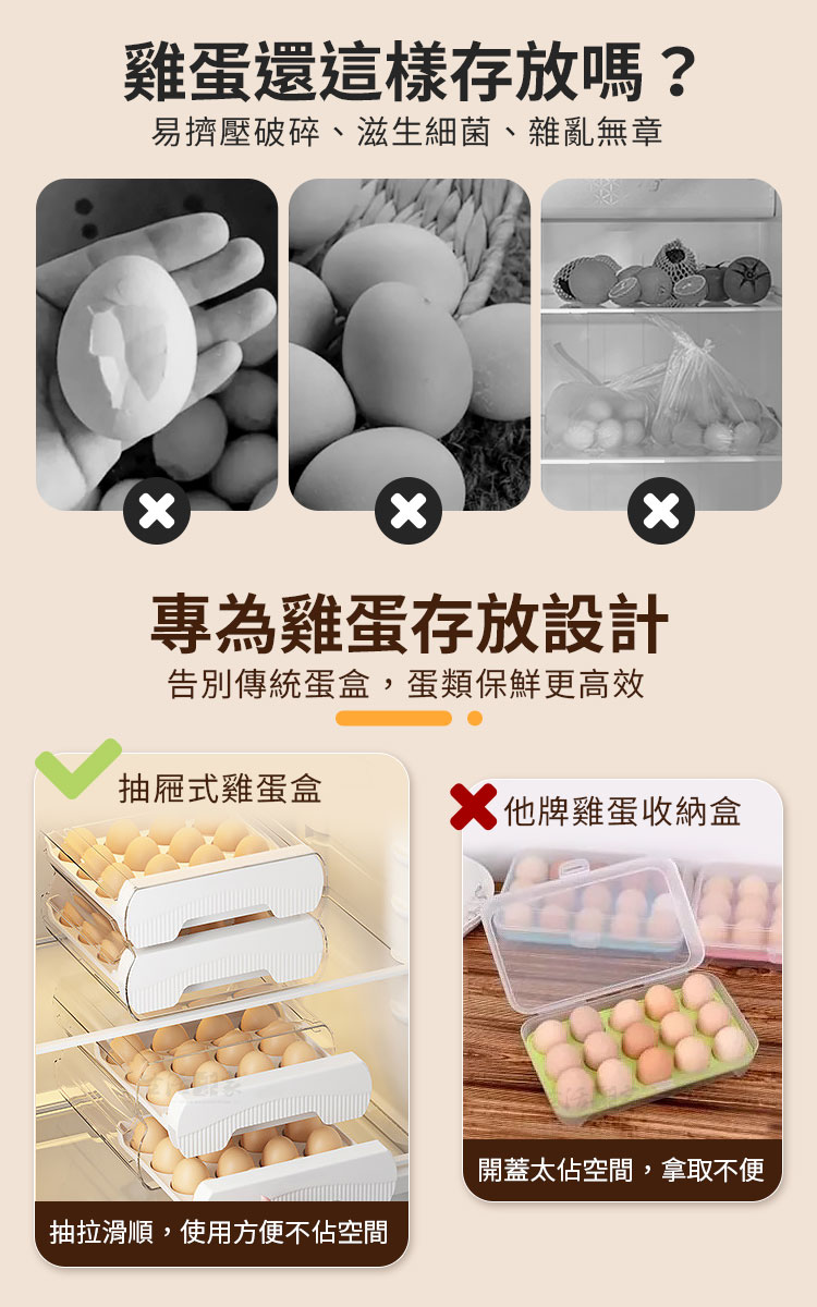 「立式存放保鮮加倍」,讓雞蛋保持新鮮,存放時間更長。「抽屜式收納易取易放」,每次取用都非常方便,不用再翻箱倒櫃找雞蛋了。「透明外殼設計」,讓存量一目了然,再也不怕用完了還不知道。🛠️👀