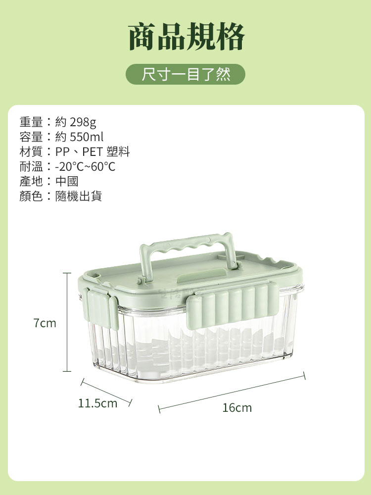 1.尺寸:約W16*L11.5*H7cm 2.材質:本體-PP、PET塑料;密封圈-矽膠 3.耐溫:-20℃~60℃ 4.容量:約550ml/個 5.重量:約298g/個 6.產地:中國 7.商品:保鮮盒*2、冰磚*2 8.顏色:綠、米白、粉三色隨機出貨
