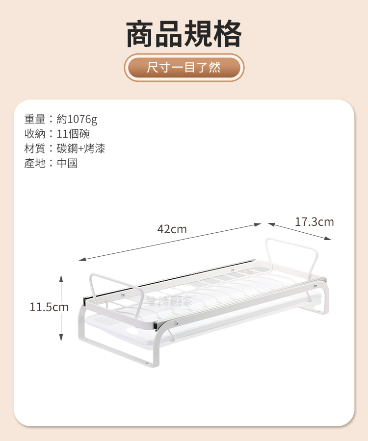1.尺寸:約長42*寬17.3*高11.5cm 2.材質:碳鋼+烤漆 3.重量:約1076g/組 4.產地:中國 5.收納:11個碗 6.商品:櫥櫃收納抽拉式滑軌碗盤架 大號白色單層碗架*1