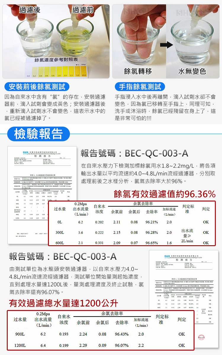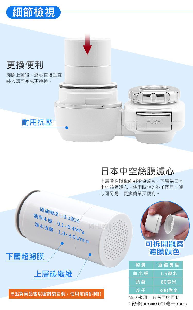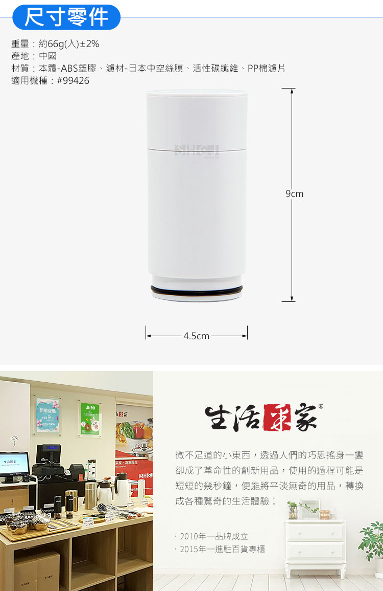 1.尺寸:W4.5*D4.5*H9cm 2.材質:本體-ABS塑料 3.濾材:高密度活性碳纖維、超濾中空絲膜、PP棉濾片 4.重量:約66g(支)±2% 5.水溫:5~40℃以下 6.過濾精度:0.3微米 7.適用水壓:0.1~0.4MPa 8.淨水流量:1.0~3.0L/min 9.過濾總水量:約1000~1200公升 10.時效:3~6個月(根據當地水質和用量而異) 11.產地:中國 12.適用:家用自來水 13.入數:4入 14.報告:SGS檢驗BA/2018/51724(重金屬及酸鹼值)、BA/2018/60305(總菌落數及大腸桿菌群) 15.適用機種:#99426、#99428