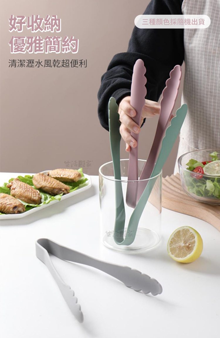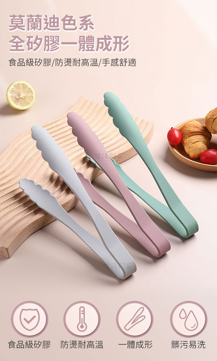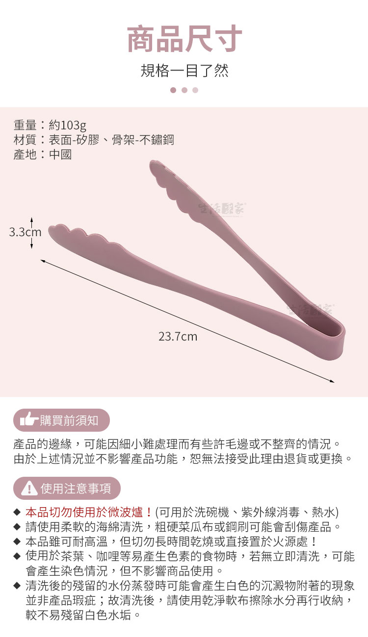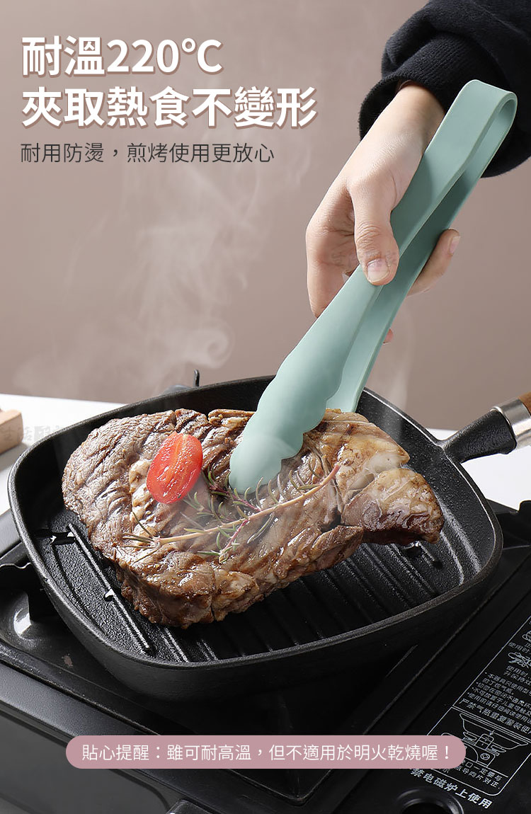 👉總長23.7cm剛剛好~ 👉太長不好夾、太短怕被油噴到。 👉內置430不鏽鋼骨架,強度佳不變形。 👉矽膠可耐高溫,夾取熱食沒問題。 👉可夾麵包、蛋糕點心、蔬菜、麵條、肉排、魚類、炸物等。 👉矽膠包覆,不怕刮傷鍋面,不會損壞到您心愛的鍋子。 👉不用時可吊掛、放抽屜或放筷筒收納,完全不佔空間。