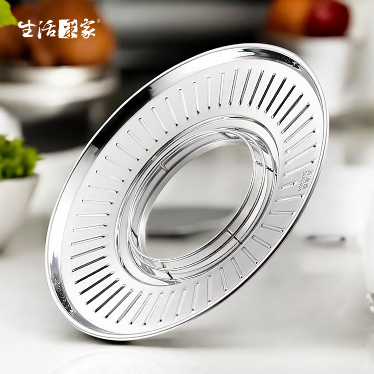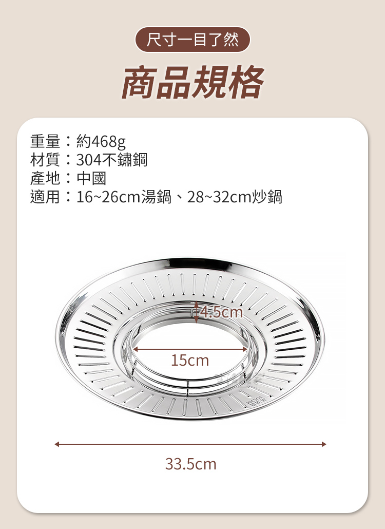 1.外徑尺寸:約直徑33.5*高4.5cm 2.內徑尺寸:約15cm 3.材質:304不鏽鋼 4.重量:約468g/入 5.適用:16~26cm湯鍋、28~32cm炒鍋 6.產地:中國 7.商品:圓形油炸瀝油盤 304不鏽鋼通用款*1