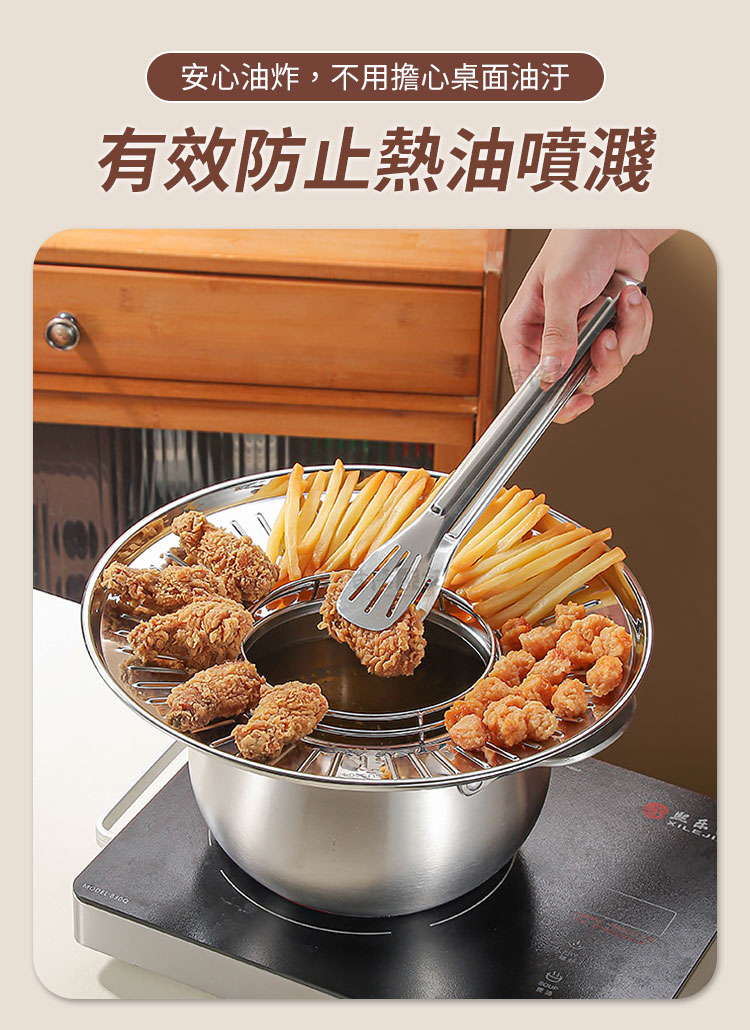 炸完後抖一抖,炸油迅速流入鍋中,告別油膩的口感~每一口都是美味酥脆!😋而且採用304不鏽鋼材質,防鏽耐用,讓你安心使用,家人吃得更放心。