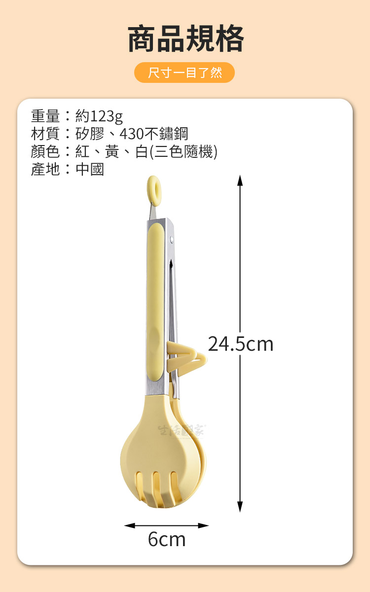 1.尺寸:約長24.5*寬6*高3.5cm 2.材質:矽膠、430不鏽鋼 3.重量:約123g/支 4.耐熱:-40℃~230℃ 5.產地:中國 6.顏色:紅、黃、白(隨機出貨) 7.適用:防燙、烹飪、料理、烘培等