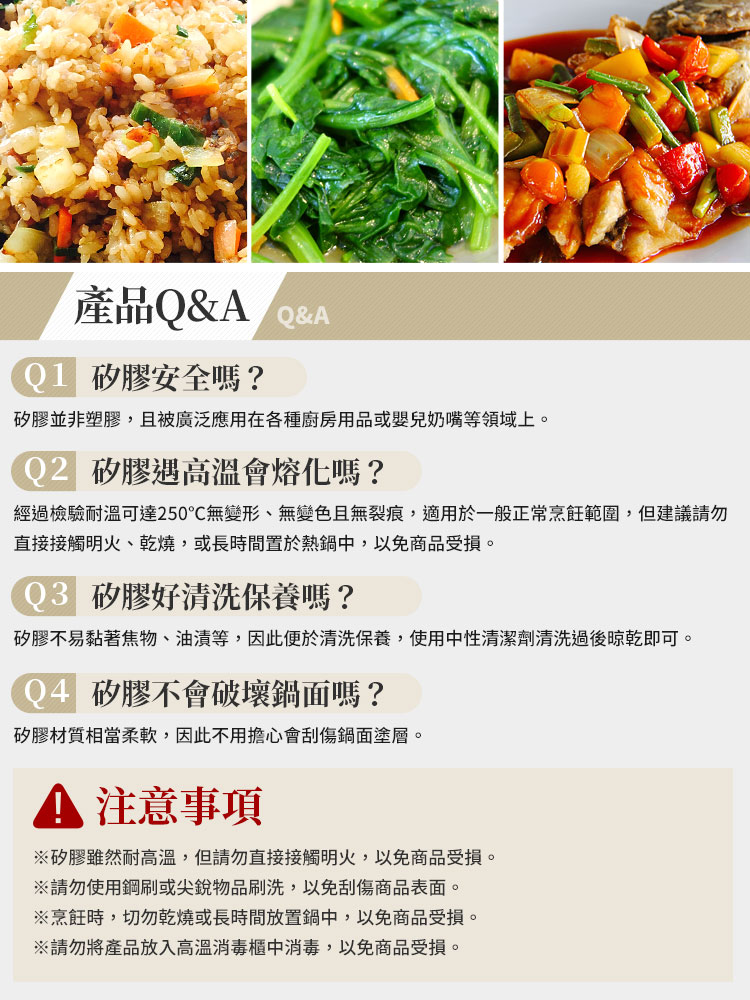 注意事項: 1.商品使用清潔後,請置於室內通風處乾燥處存放。 2.商品情境圖片僅供參考,實際出貨時不含週邊道具及配件。 3.矽膠雖然耐高溫,但請勿直接接觸明火或長時間置於鍋內加熱,以免商品受損。 4.購買前請先量測使用區域尺寸,確定無誤再購買以免尺寸不合,敬請謹慎選購。 5.使用或清洗時請勿使用鋼刷或尖銳物品刷洗,以免破壞或刮傷表面。