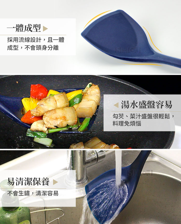 ◆適用平底鍋、煎鍋、炒鍋~炒飯、炒菜、肉類、海鮮等料理。 ◆整支鍋鏟一體成型,不會頭身分離,久用不脫落,經久耐用。 ◆結實耐用,全矽膠整體包覆,耐熱性佳無異味,更加得心應手。 ◆矽膠質地柔軟,攪動或翻炒時不傷鍋面,不用擔心鍋面磨損問題。 ◆正面藍點止滑,背面手指凹槽,使用時正確握姿,翻炒或盛湯更加順手。 ◆每款後面都有支點,短暫倚靠鍋緣時可固定位置,不會從鍋邊滑落至鍋內。 ◆上方吊掛孔,使用前或清洗後都可吊掛收納,完全不佔空間,料理超輕鬆。 ◆矽膠不沾,使用後只需使用清水或中性清潔劑清洗,不會有生鏽或卡垢的問題。 ◆商品經SGS檢驗合格,商品不含塑化劑、耐熱可達250度,日常使用食安沒問題。 ◆矽膠材質靭度強,扭轉拉扯也不容易損壞,耐用程度相當高,長期使用也不容易壞。 ◆適用一般家庭、單身貴族、營業場所、租屋族、學生族群,喜愛下廚的朋友們千萬不能錯過。