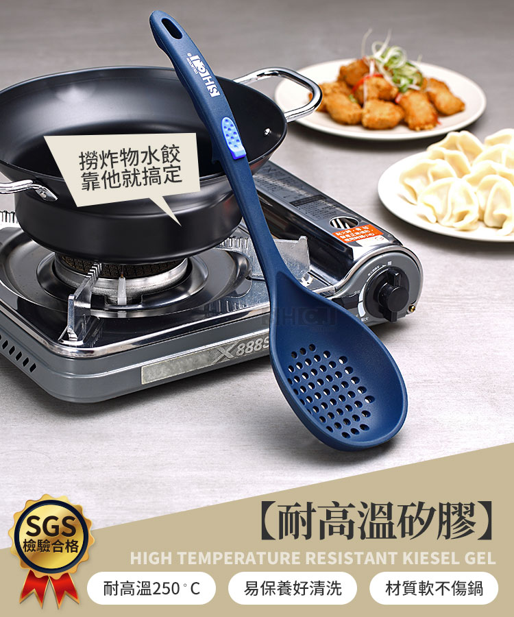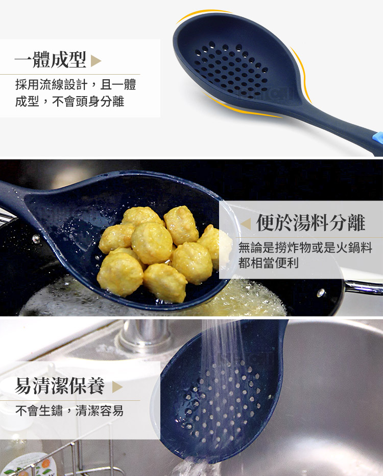 ◆適用於盛水餃、炸物或燙青菜、丸類、魚肉等川燙類食物料理。 ◆整支漏勺一體成型,不會頭身分離,久用不脫落,經久耐用。 ◆結實耐用,全矽膠整體包覆,耐熱性佳無異味,更加得心應手。 ◆矽膠質地柔軟,攪動或盛物時不傷鍋面,不用擔心鍋面磨損問題。 ◆正面藍點止滑,背面手指凹槽,使用時正確握姿,翻炒或盛湯更加順手。 ◆每款後面都有支點,短暫倚靠鍋緣時可固定位置,不會從鍋邊滑落至鍋內。 ◆上方吊掛孔,使用前或清洗後都可吊掛收納,完全不佔空間,料理超輕鬆。 ◆矽膠不沾,使用後只需使用清水或中性清潔劑清洗,不會有生鏽或卡垢的問題。 ◆商品經SGS檢驗合格,商品不含塑化劑、耐熱可達250度,日常使用食安沒問題。 ◆矽膠材質韌度強,扭轉拉扯也不容易損壞,耐用程度相當高,長期使用也不容易壞。 ◆適用一般家庭、單身貴族、營業場所、租屋族、學生族群,喜愛下廚的朋友們千萬不能錯過。