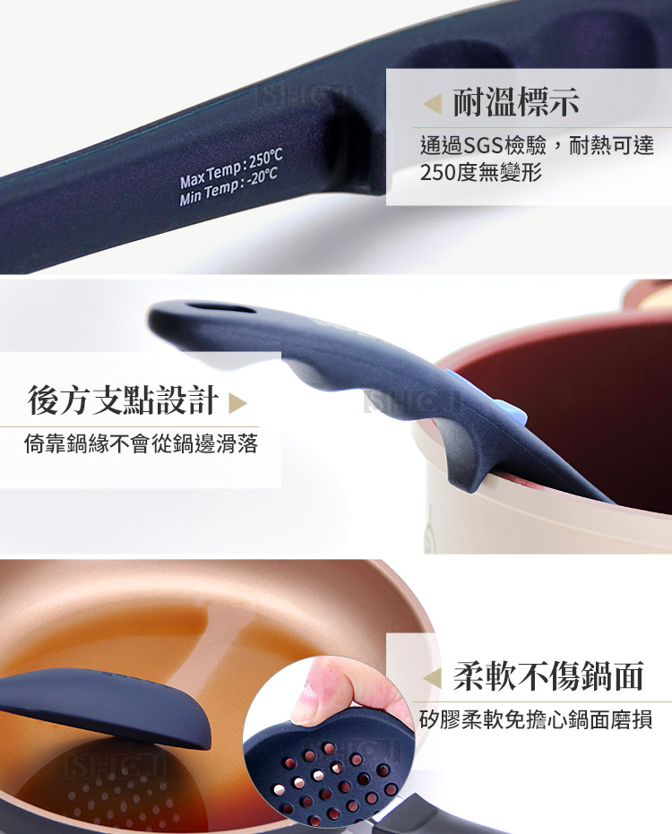 鍋鏟或湯勺刮傷不沾鍋?手柄斷裂?熔化生鏽?遇到這些狀況,怎能安心做好一頓好飯!!! 真正不傷鍋子的廚房矽膠工具~全矽膠包覆,整支一體成型,耐高溫不易變形且鏟面或勺面柔軟度極佳,使用時平順貼合鍋面,不會刮傷鍋子的不沾塗層,可延長鍋子的使用壽命。經SGS檢驗合格,耐熱可達 250度 、商品不含塑化劑,沒有食安問題,絕對是您料理烹飪的最佳選擇。