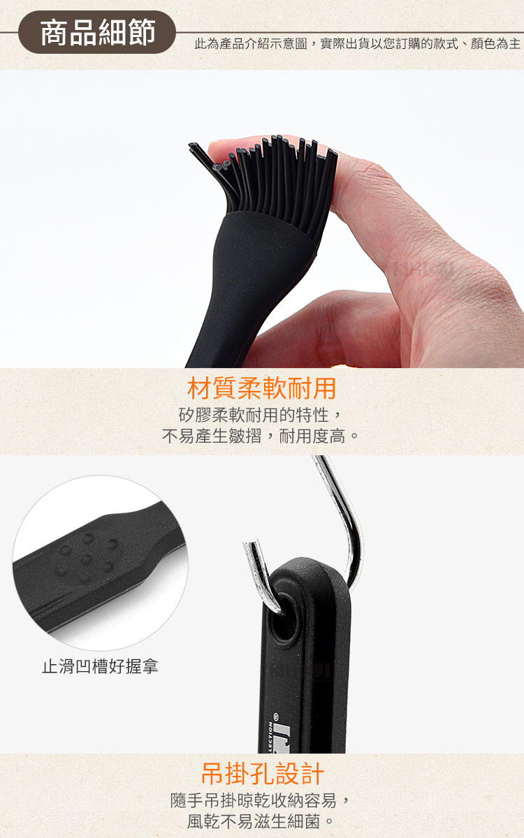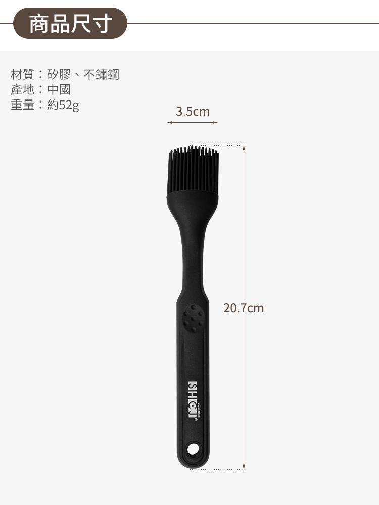 1.尺寸:W3.5*L20.7cm 2.材質:矽膠、不鏽鋼 3.重量:約52g/入 4.顏色:黑色 5.產地:中國 6.商品:矽膠刷*1